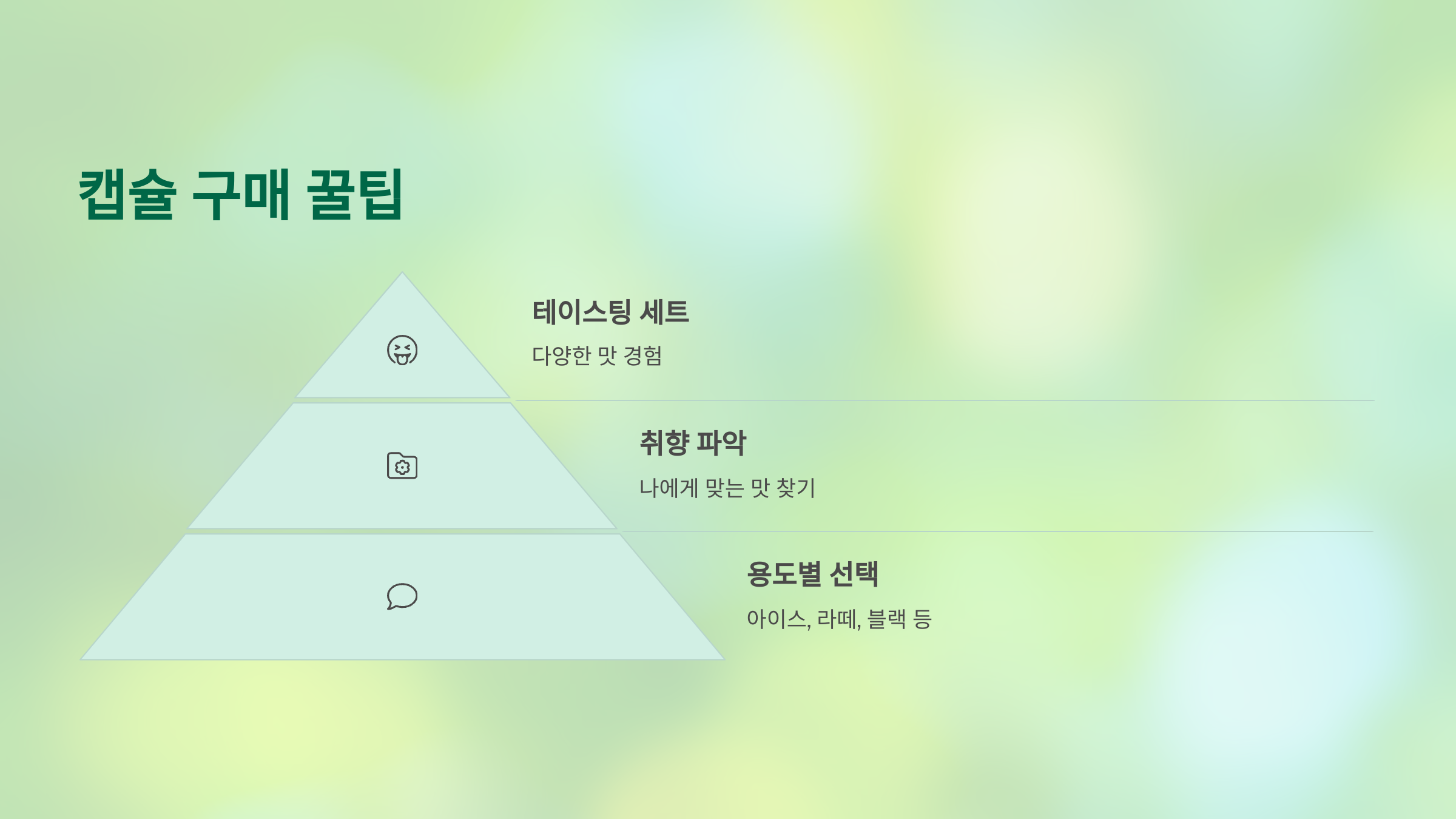 각기 다른 풍미를 지닌 캡슐들을 목적별로 정리해 드릴 테니, 취향 저격 캡슐을 쉽게 고르실 수 있을 거예요!