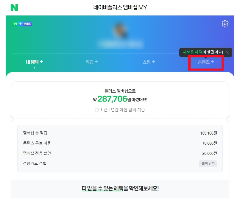 '멤버십 MY' → '콘텐츠+' 메뉴로 이동합니다.