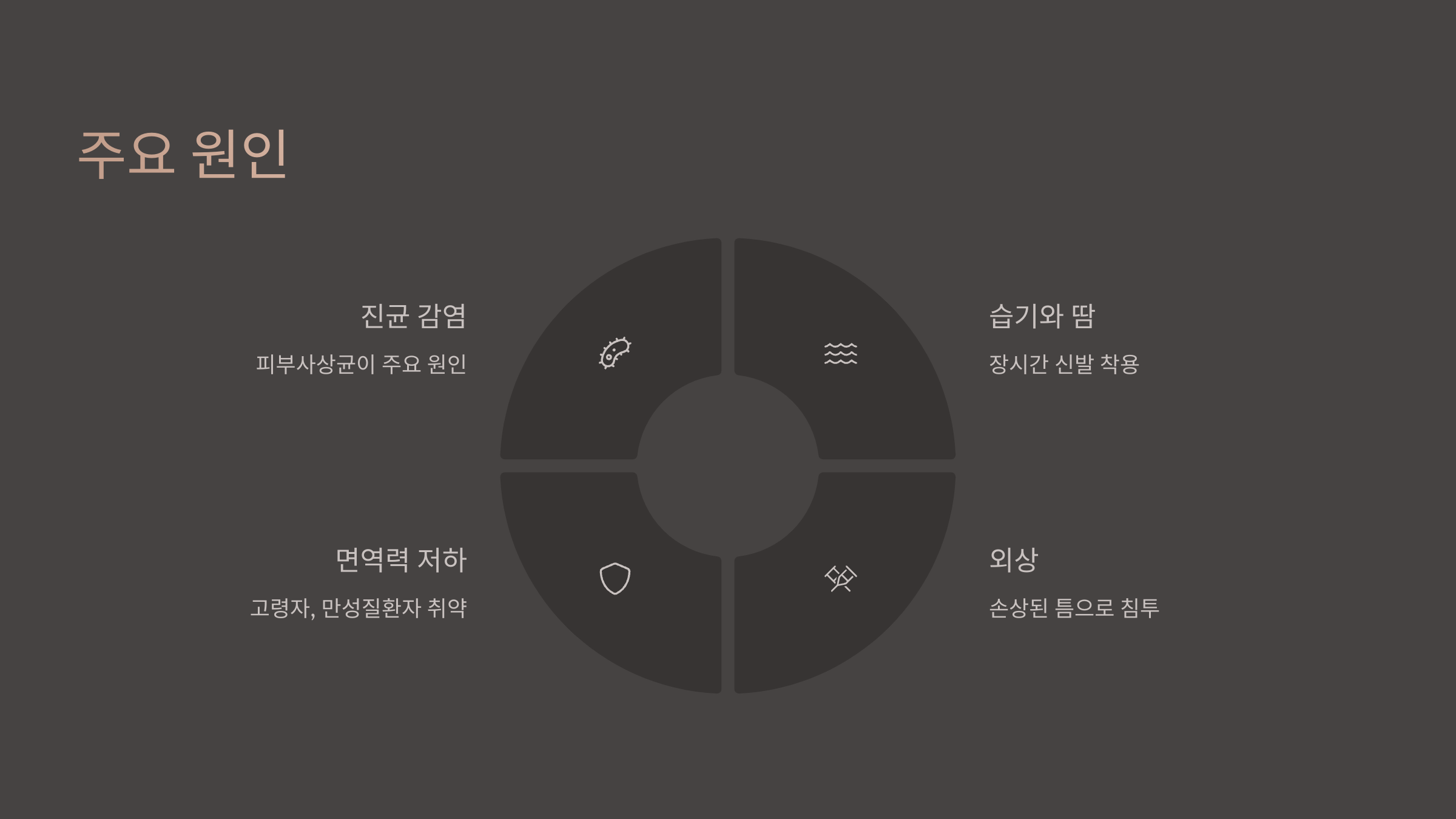 1. 진균 감염 - 가장 일반적인 원인은 피부사상균(Tinea species)이라는 곰팡이 감염입니다. 이 균은 따뜻하고 습한 환경을 좋아해 발가락 사이, 발바닥, 발톱 밑 등에 서식하기 좋습니다.