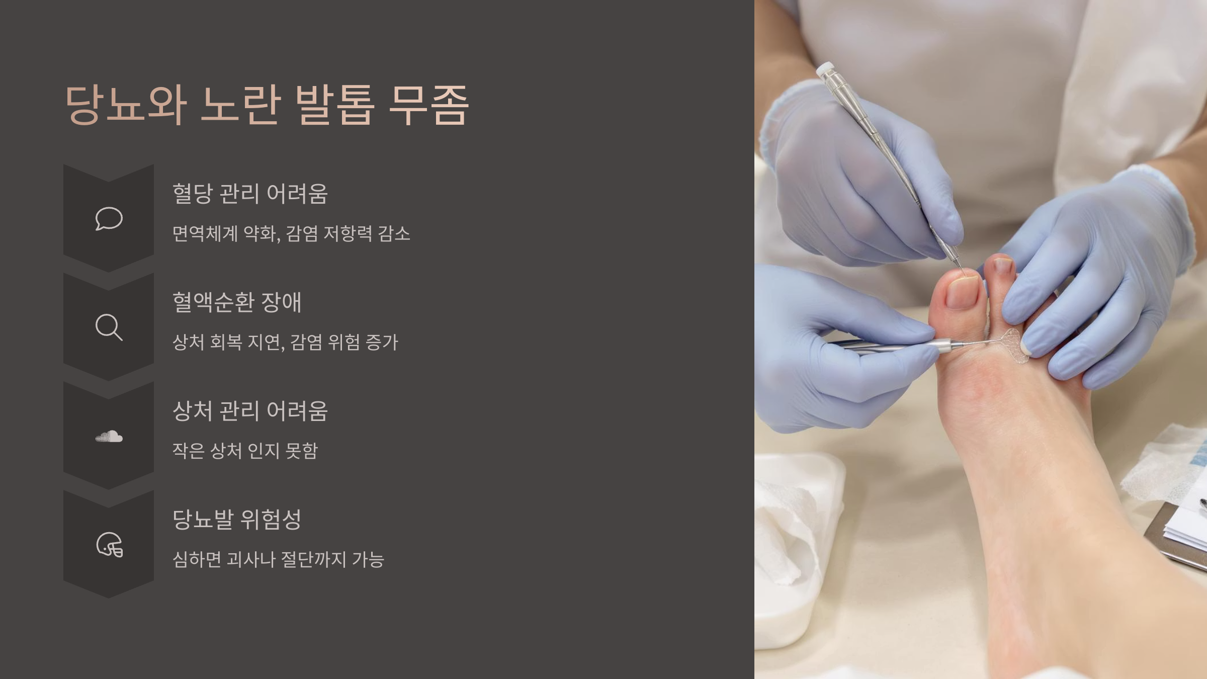 발톱이 노랗게 변하는 증상, 즉 '노란 발톱 무좀'은 단순한 미용 문제가 아닙니다. 특히 당뇨를 앓고 계신 분이라면 더욱 세심한 관리가 필요하지요.