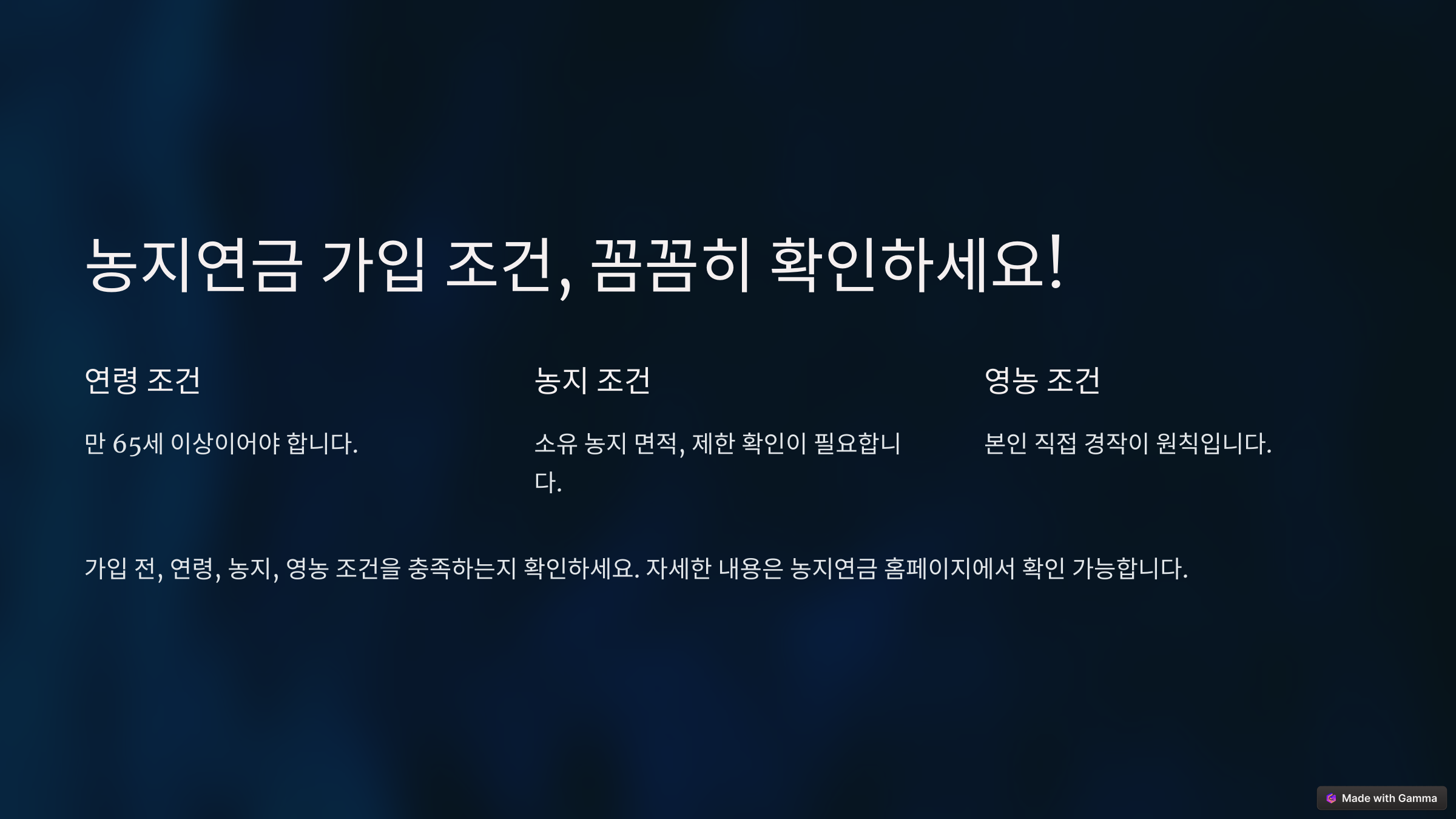 ⚠️ 주의: 연금 가입 후에는 해당 농지를 **매각하거나 담보 대출**로 활용할 수 없습니다.