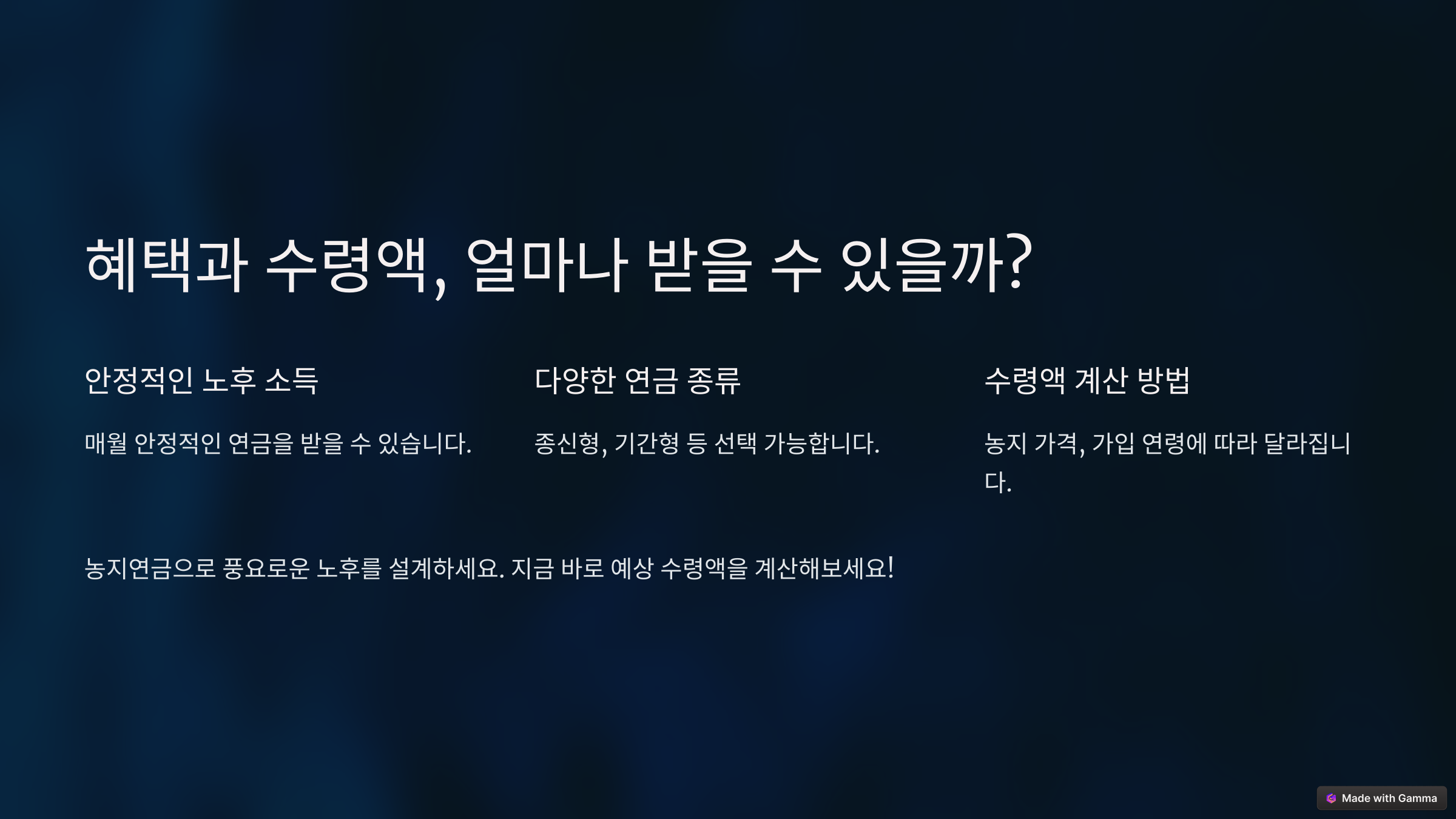 오늘은 농지연금의 가입 조건, 신청 방법, 수령액 계산까지 하나하나 꼼꼼하게 살펴봤어요. 😊