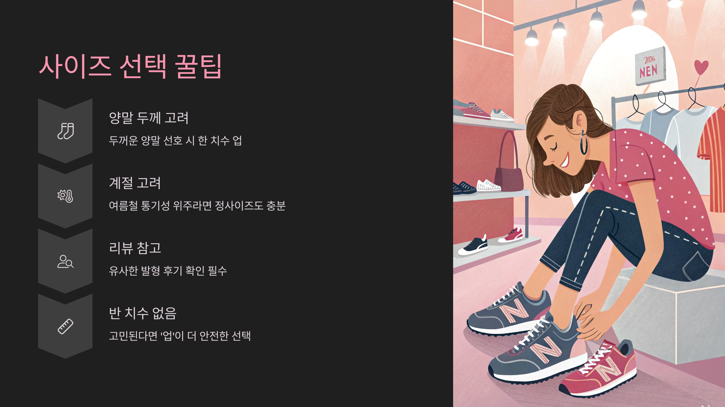 사이즈 선택은 단순히 숫자만 보는 게 아니라, 평소 착용 습관과 계절, 양말 두께까지 고려해야 해요.