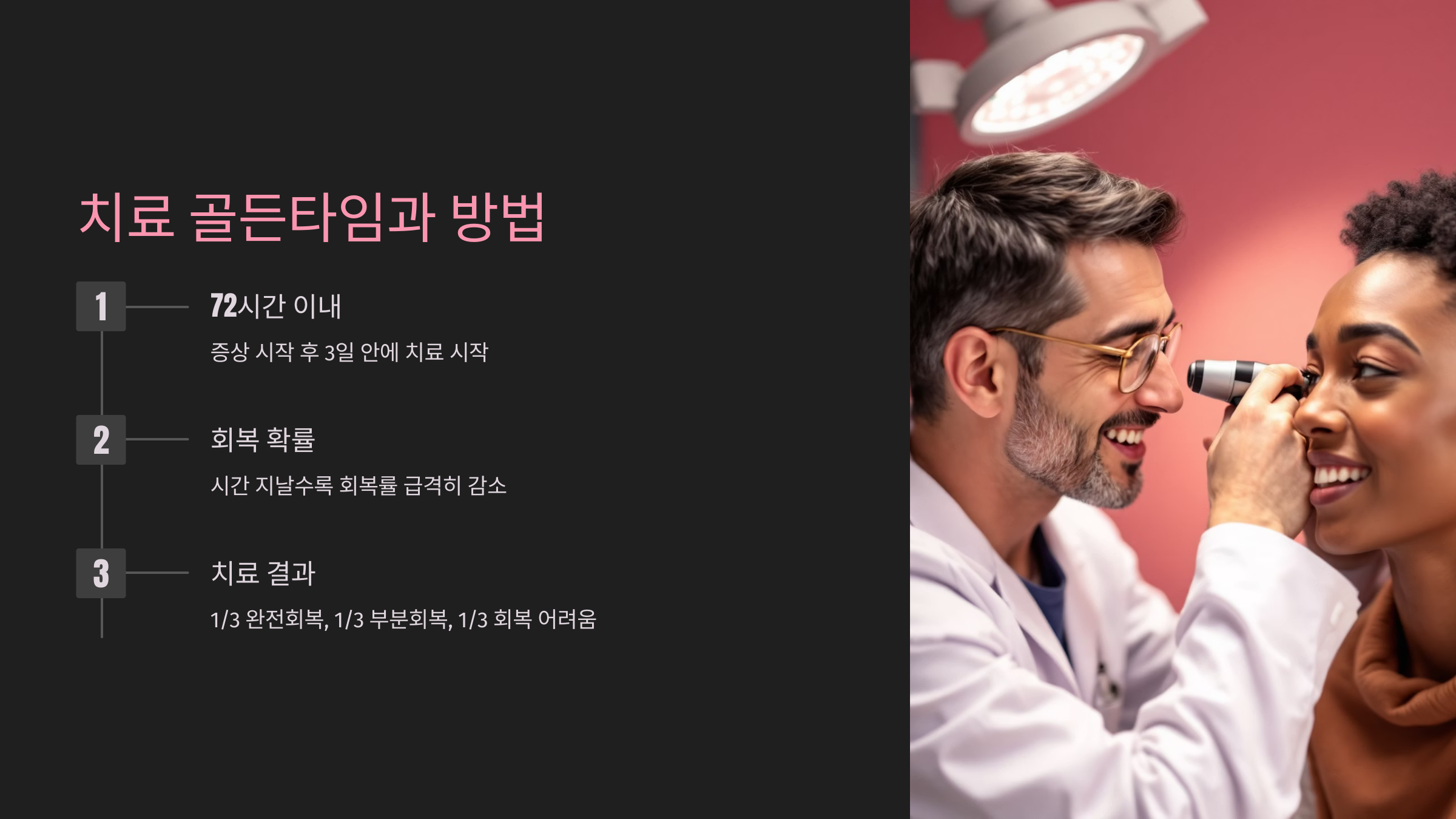 1/3은 완전 회복, 1/3은 부분 회복, 1/3은 회복이 어려운 편이니 치료 시기가 매우 중요해요.