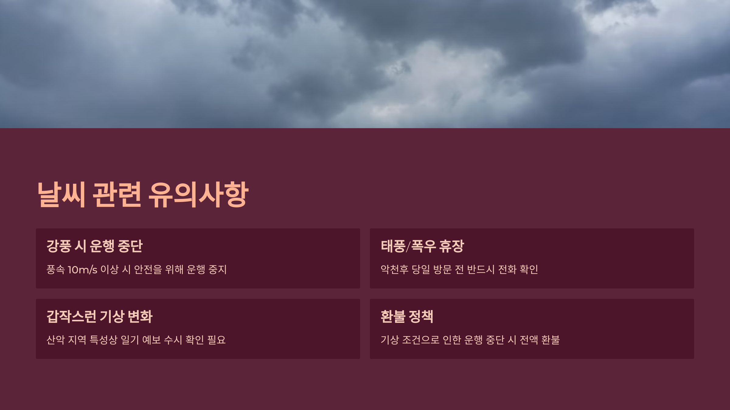 안전상의 이유로 강풍, 폭우, 눈, 짙은 안개 등의 기상 상황 발생 시 운행이 전면 중단될 수 있습니다.