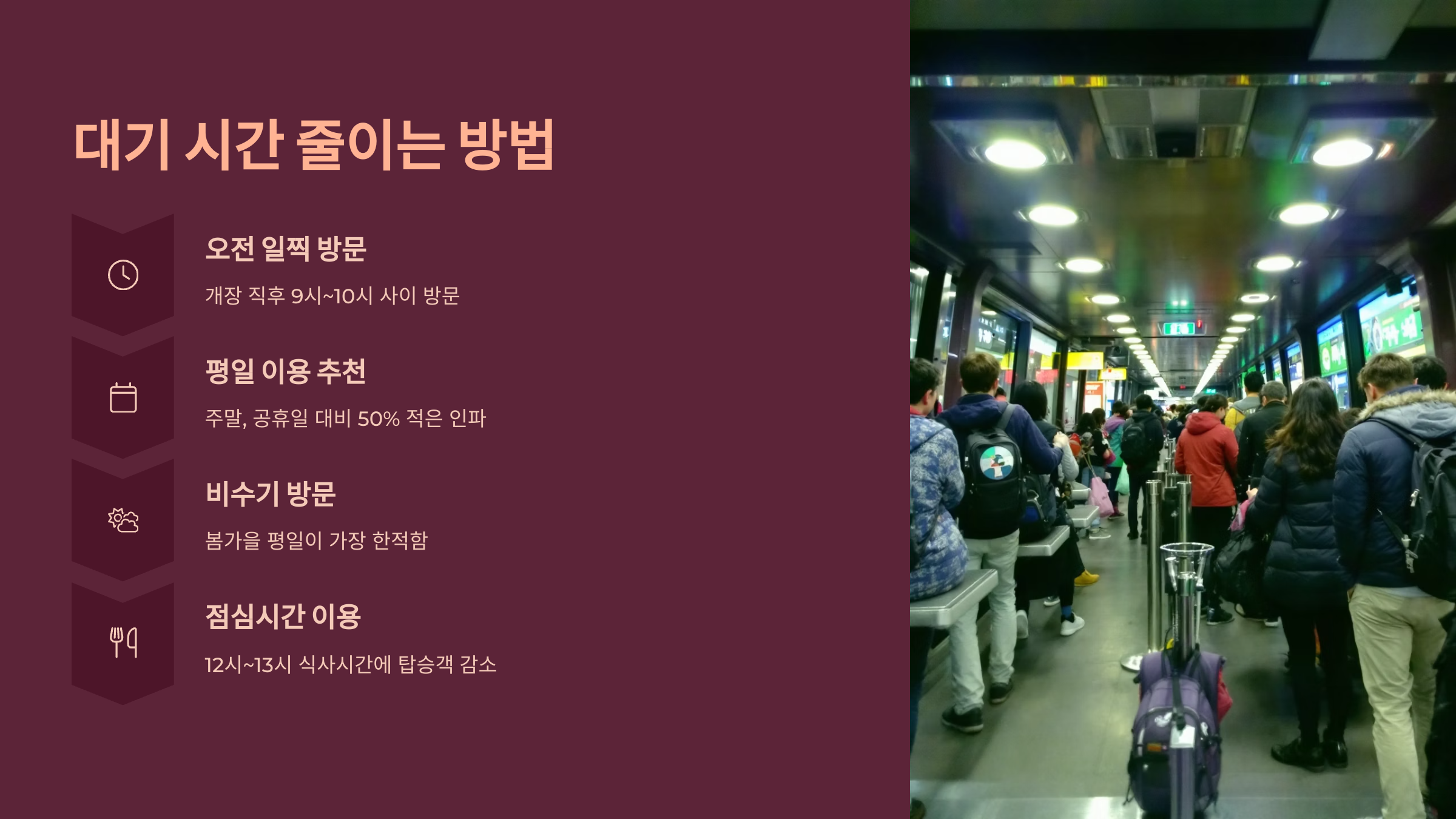 개장 시간에 맞춰 일찍 방문하거나, 주중에 방문하면 대기 시간을 줄일 수 있습니다.