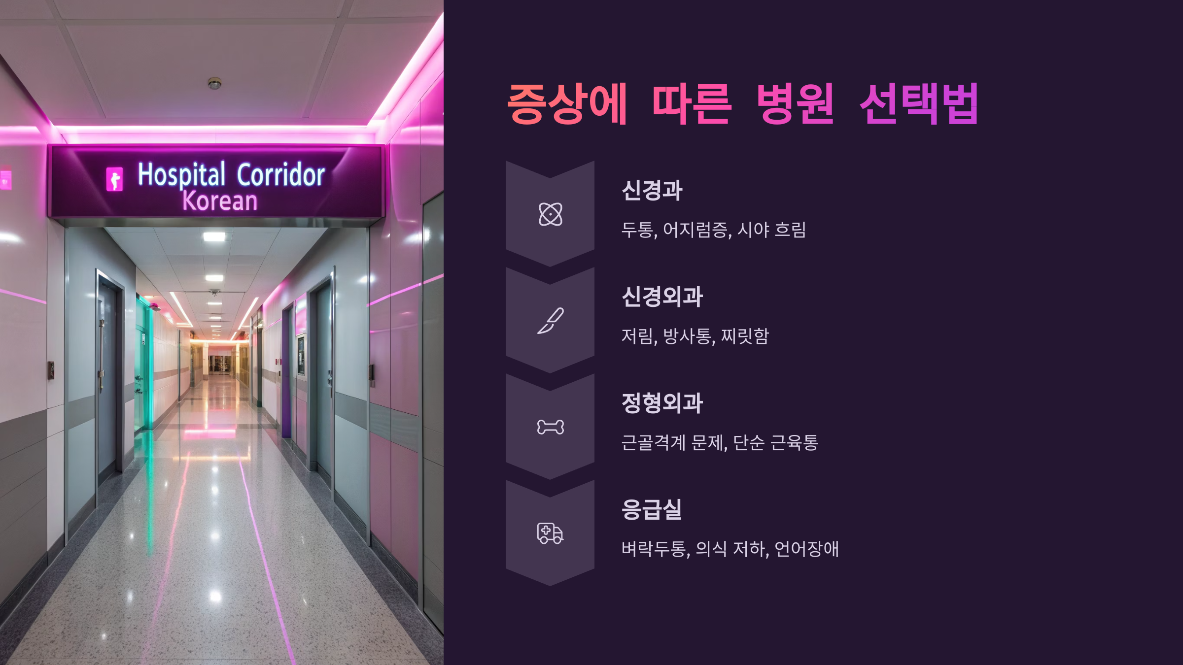 - 응급실: 벼락두통, 의식 저하, 언어장애, 마비 같은 증상이 함께 나타나면 바로 병원으로!
