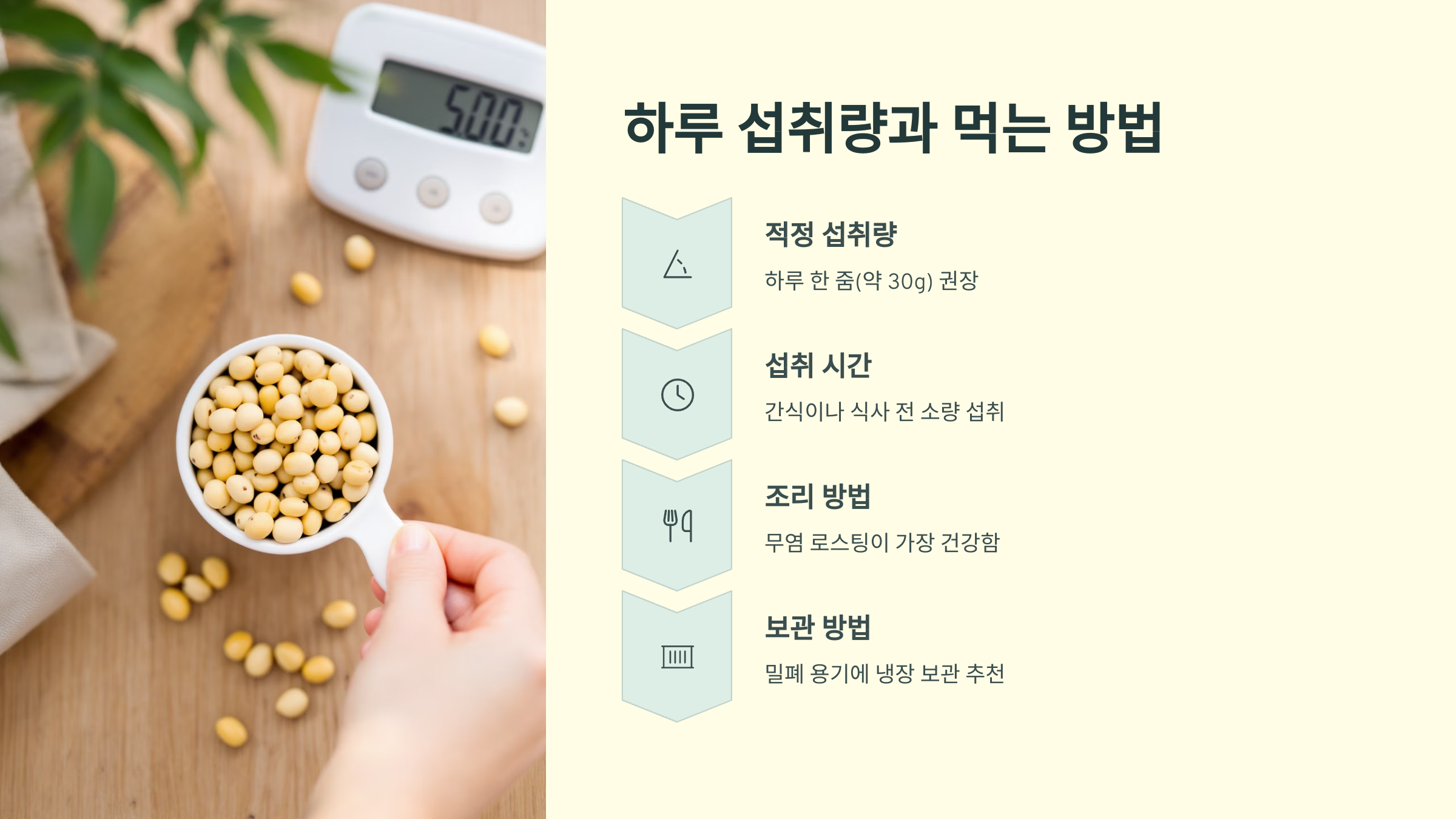 일반적으로 성인의 경우 한 줌(약 20~30g)이 적정량으로 권장돼요.