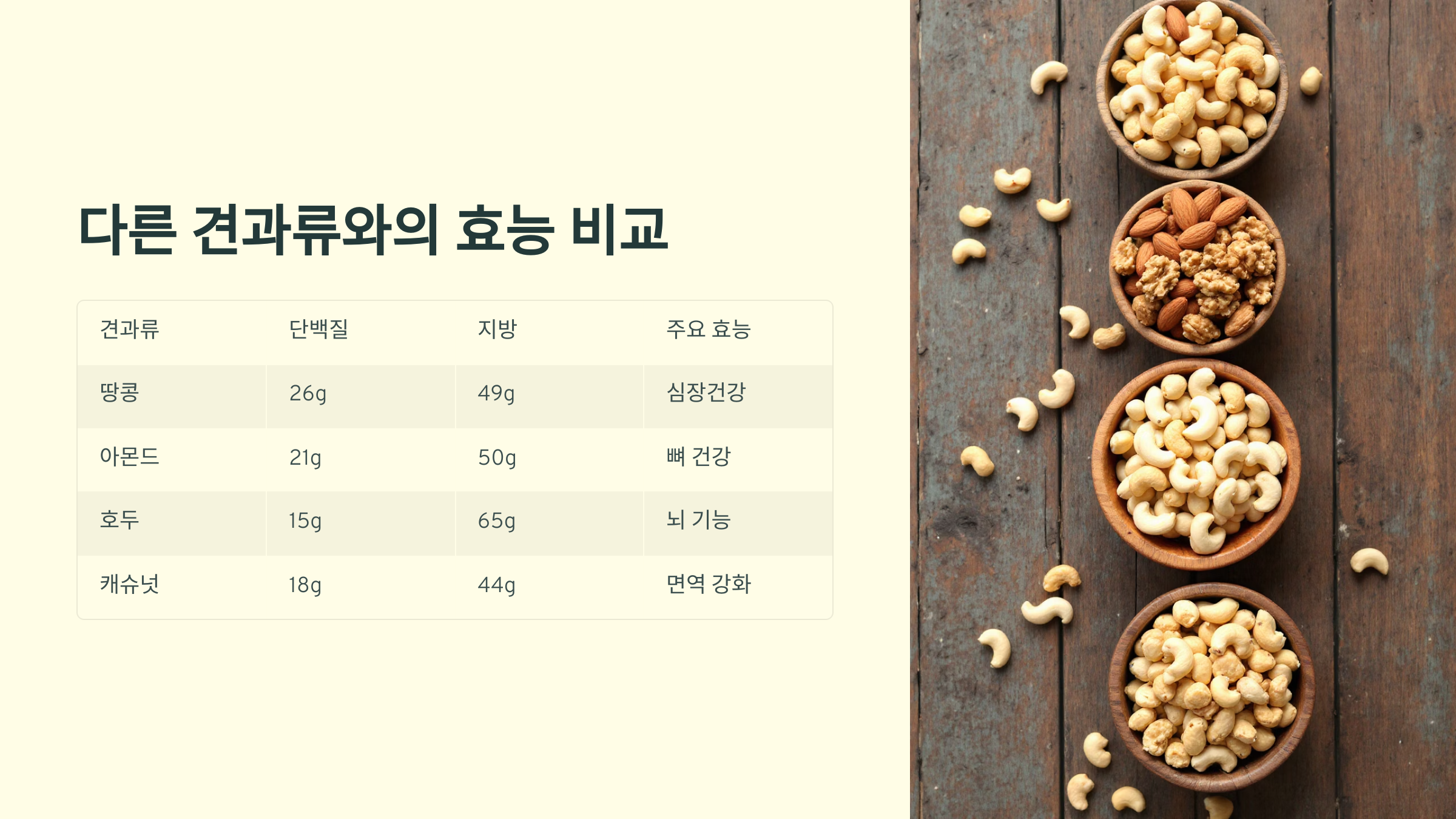 땅콩과 자주 비교되는 대표 견과류로는 아몬드, 호두, 캐슈넛 등이 있어요.