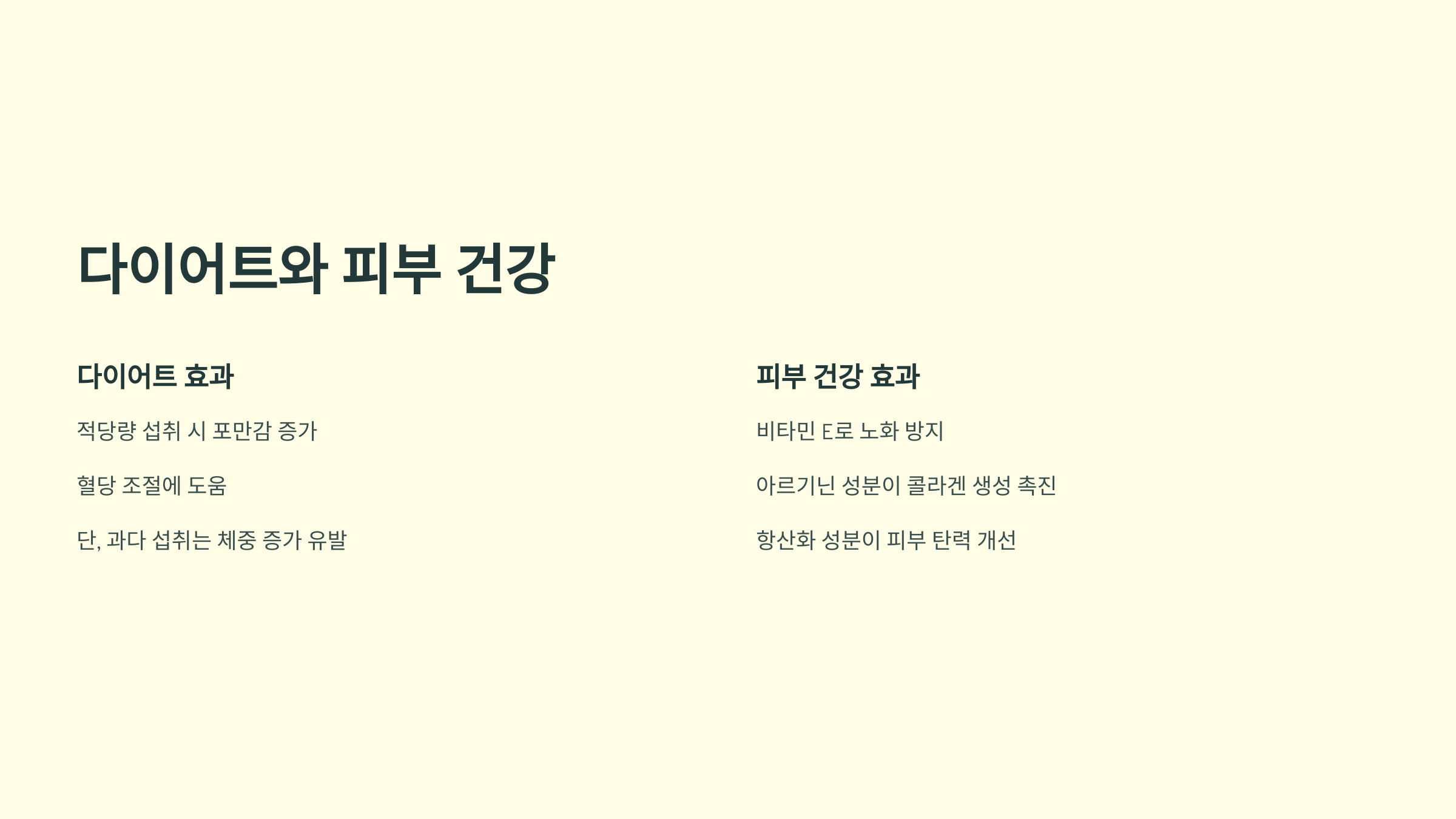 | 아몬드 | 식이섬유, 마그네슘, 칼슘 | 피부미용, 뼈 건강 |
