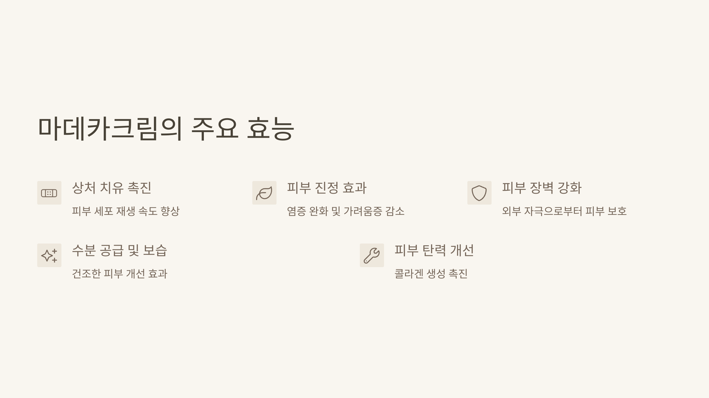 | 마데카크림 | 병풀추출물, 마데카소사이드 | 피부 재생, 진정, 순한 성분 |