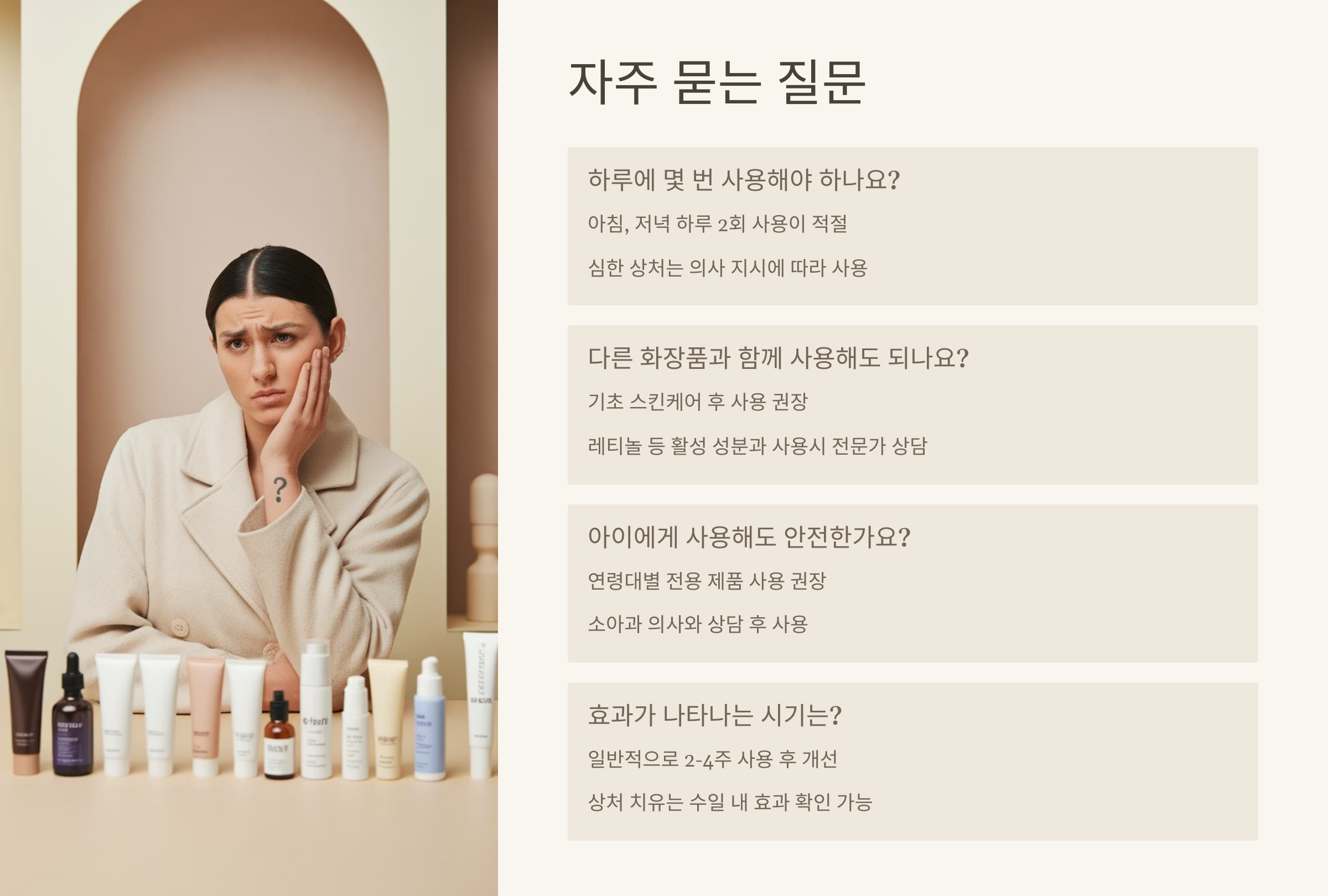 즉시 사용을 중단하고, 물로 씻어낸 후 증상이 지속되면 피부과 전문의 상담을 받아보세요.