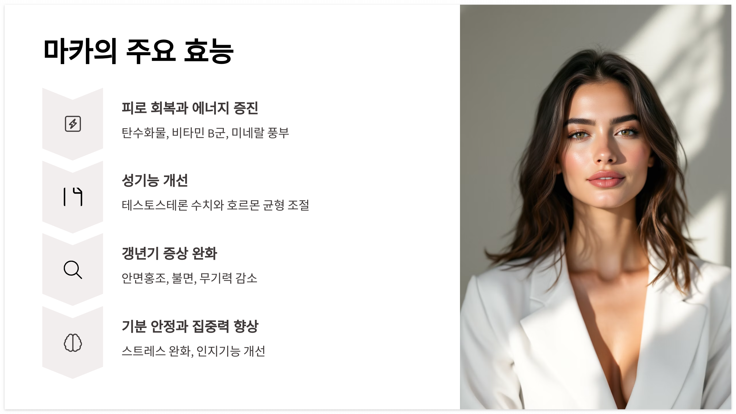 1. 피로 회복과 에너지 증진: 마카에는 탄수화물과 비타민 B군, 미네랄이 풍부해 피로를 빠르게 회복시키는 데 도움을 줍니다.