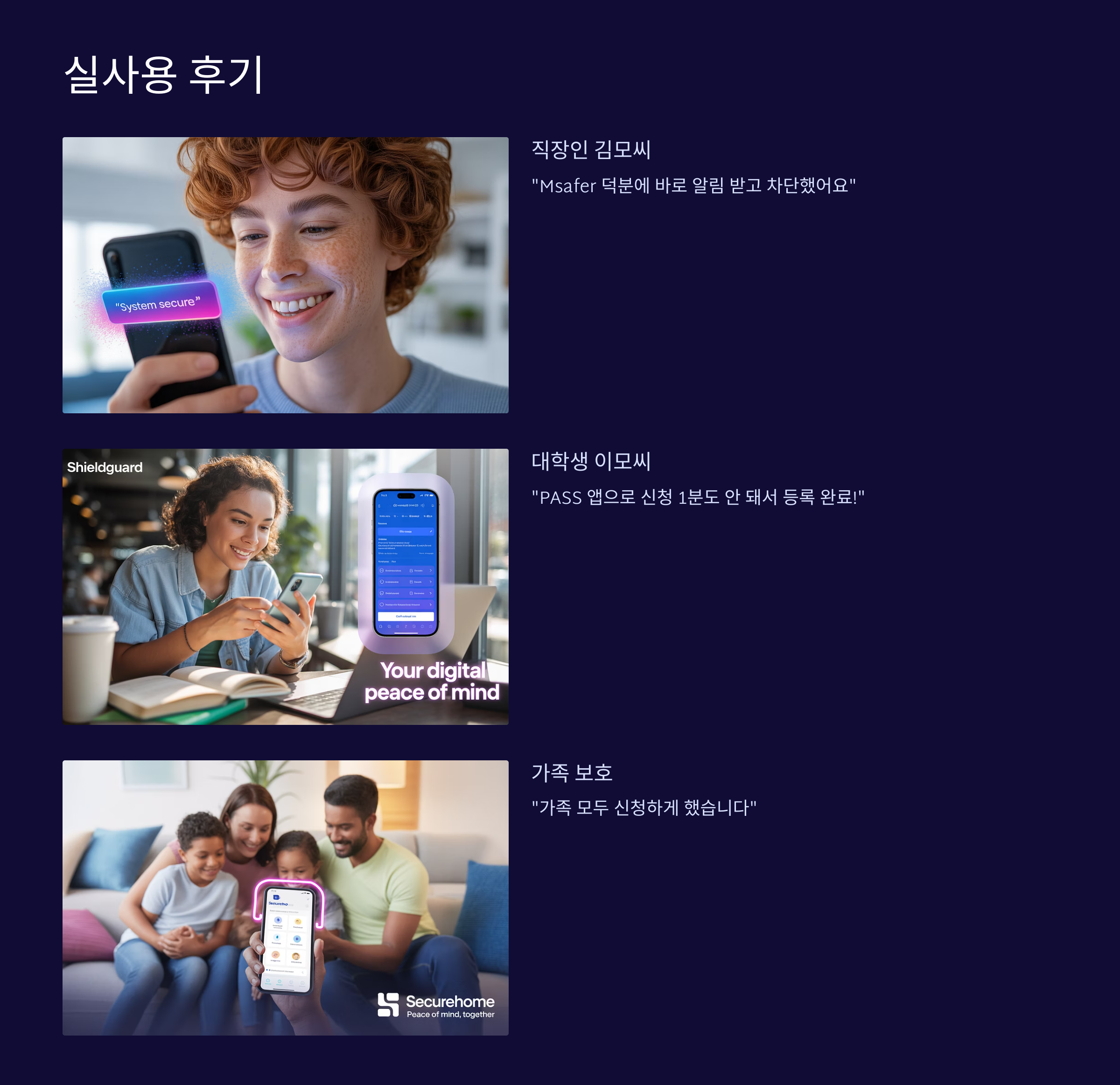 "작년에 제 명의로 누가 휴대폰을 개통하려 했는데, Msafer 덕분에 바로 알림 받고 차단했어요. 정말 신의 한 수!" - 직장인 김모씨