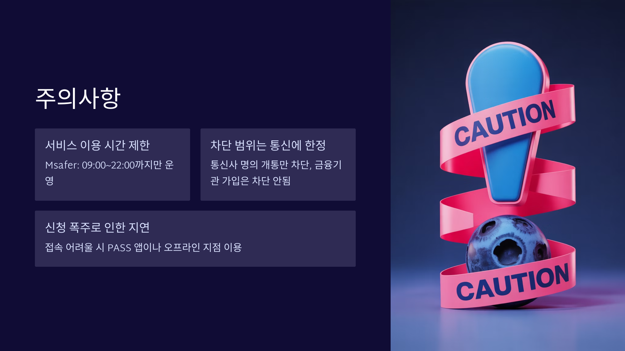 Msafer 휴대전화 개통(신규, 번호이동, 명의변경 등) 내 명의로 된 통신 개통을 사전에 막아주는 핵심 서비스