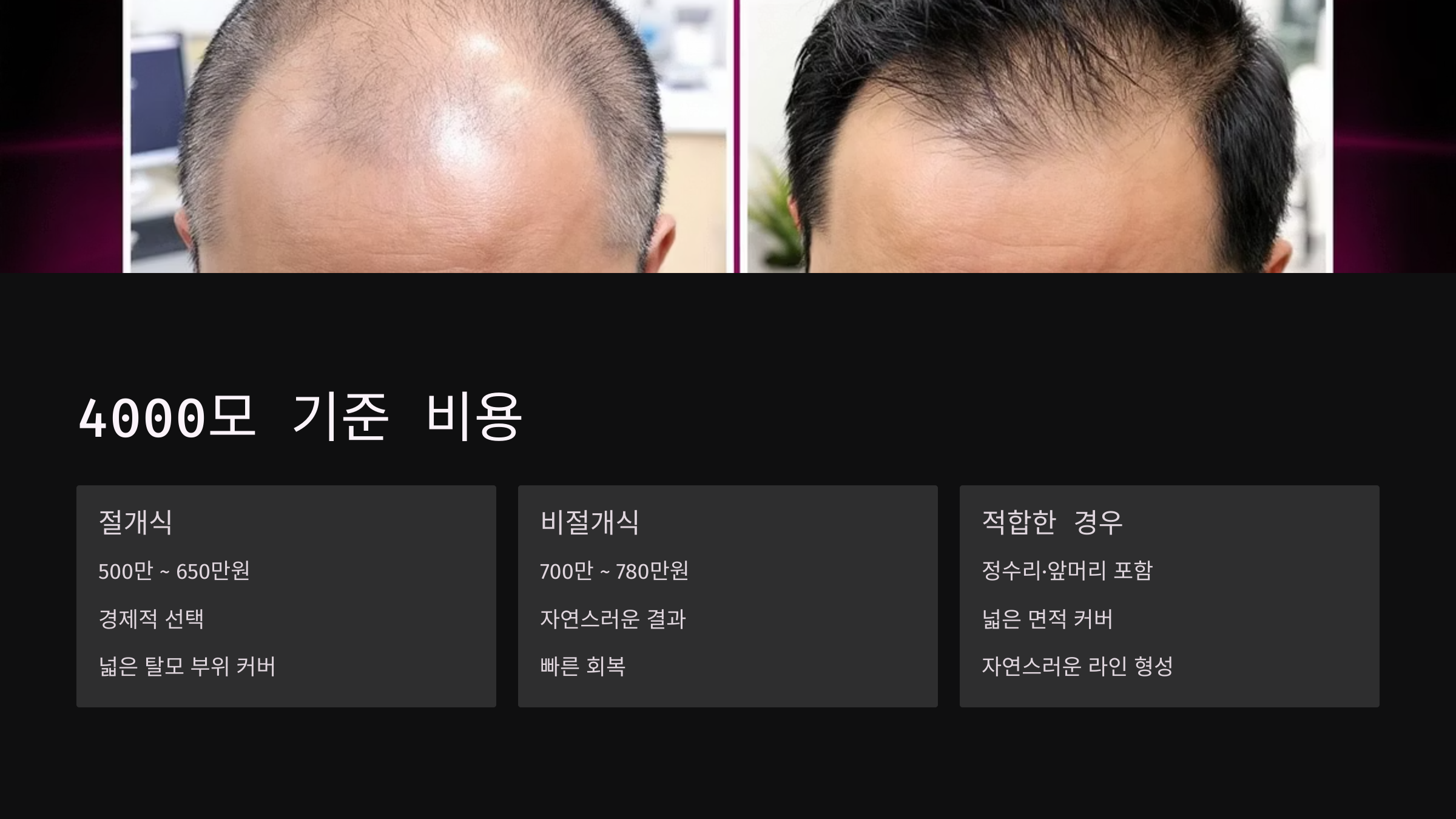 모발이식이 필요한 범위가 크거나, 자연스러운 라인 형성을 원하신다면 4000모 수술이 적합할 수 있어요.