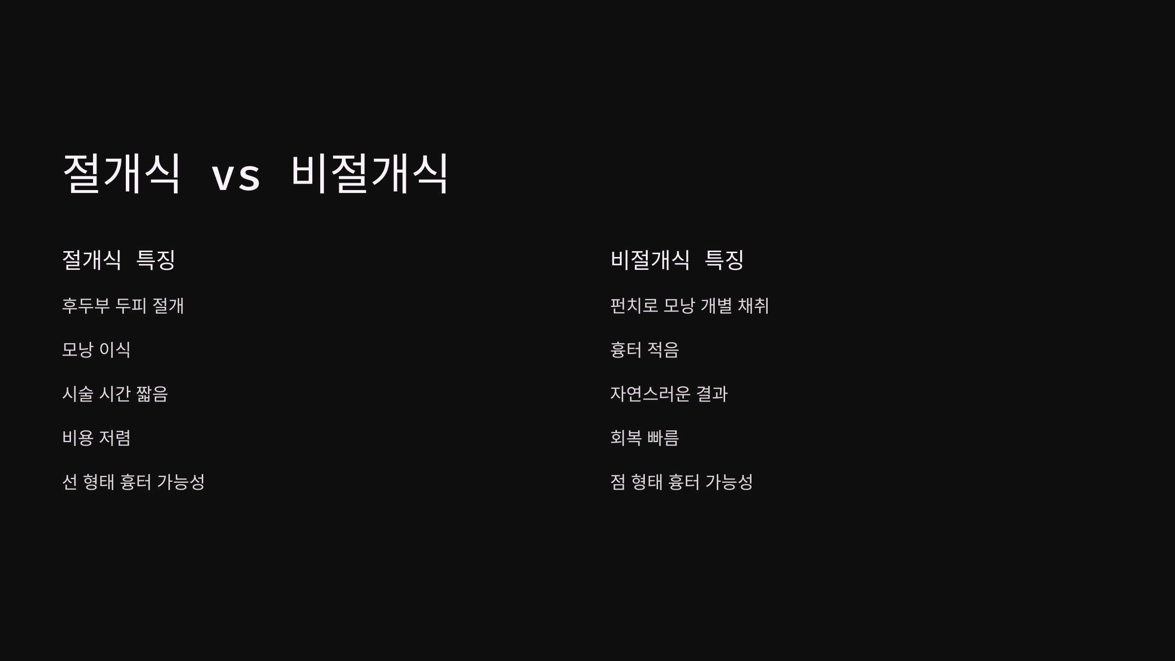 특히 절개식은 선 형태의 흉터, 비절개식은 점 형태의 흉터가 남을 수 있다는 점도 고려해야 해요.