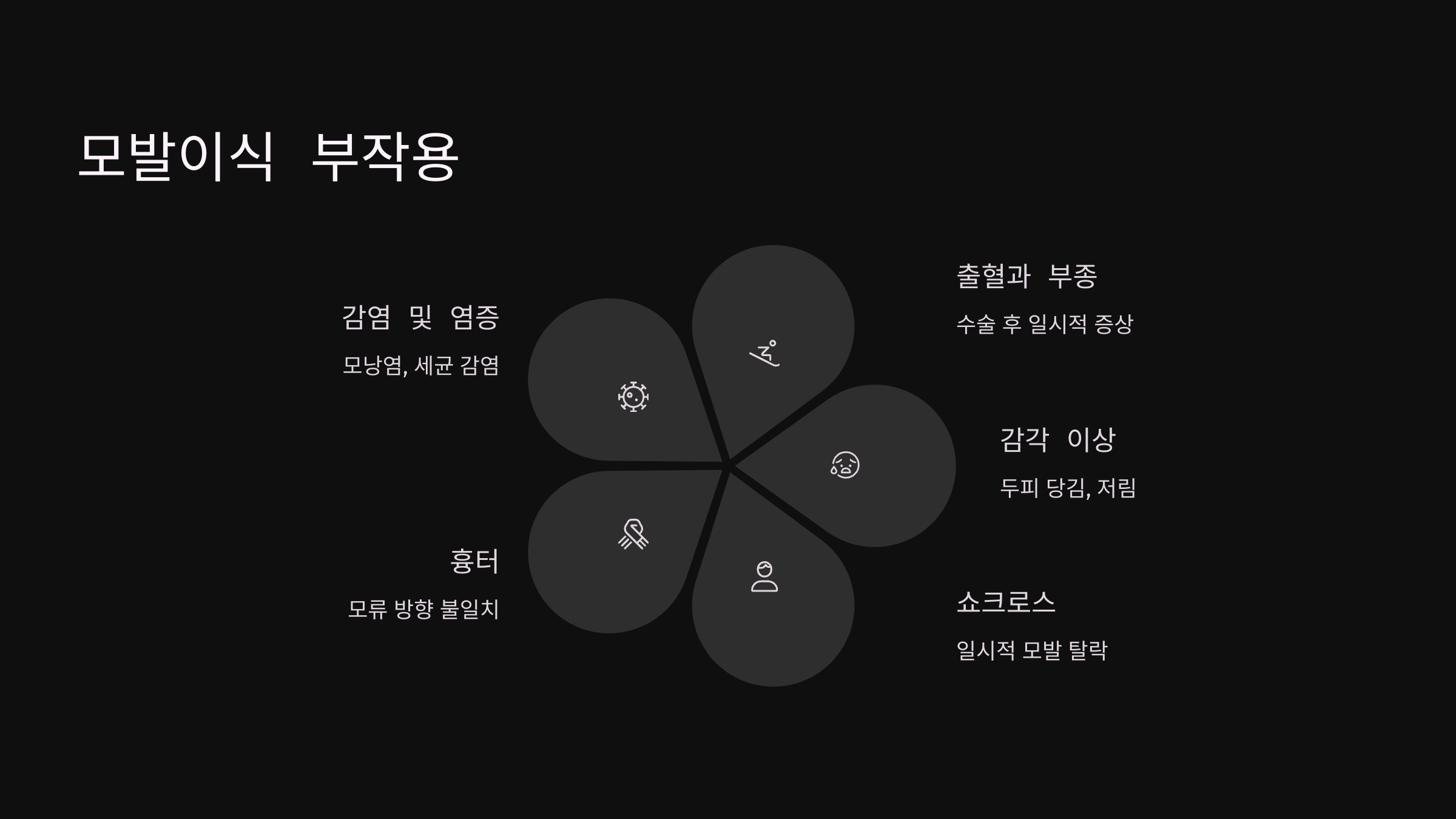 ⚠️ 주의: 모발이식의 부작용은 대부분 혈액순환 장애에서 비롯되며, 이를 예방하려면 수술 전후 금연이 매우 중요합니다.