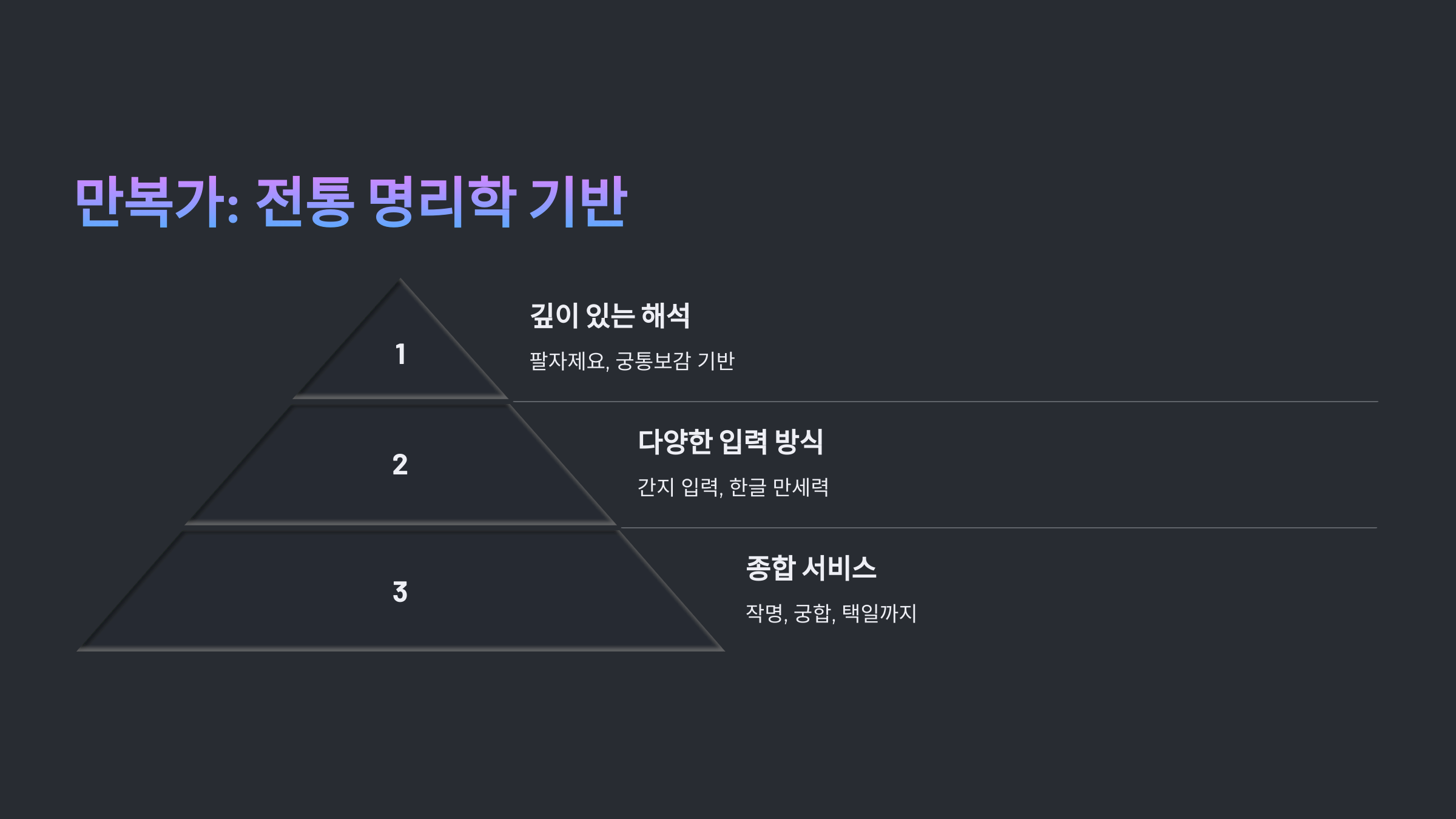 만복가는 팔자제요, 궁통보감 등 전통 명리학 자료에 기반해 깊이 있는 해석을 제공하는 것이 가장 큰 특징이에요.