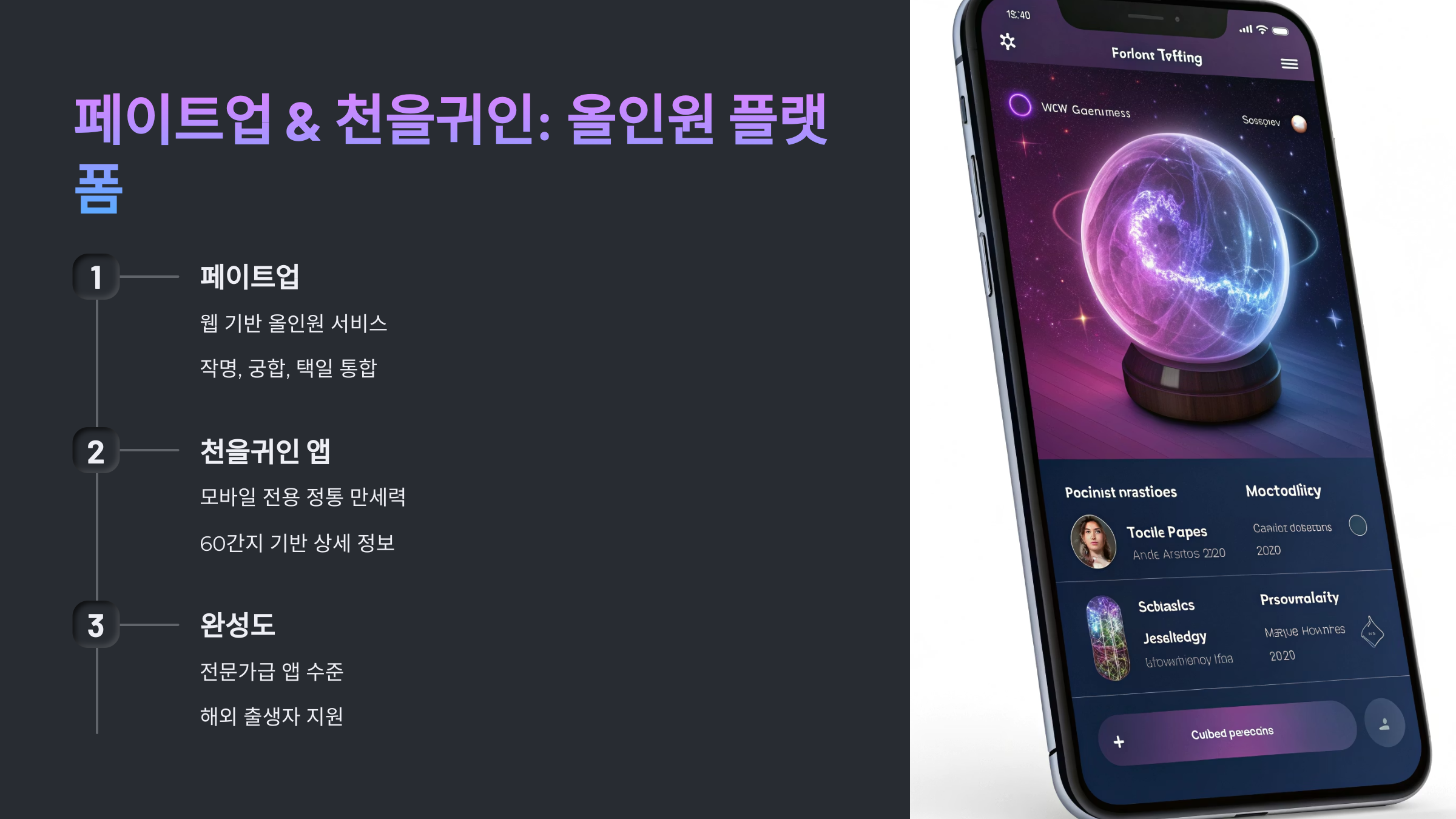 페이트업(FateUp)은 기본적인 사주 명식 제공은 물론, 작명, 궁합, 택일 등 부가 서비스까지 지원하는 ‘올인원’ 만세력 플랫폼이에요.
