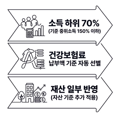 실제로는 기준 중위소득 150% 이하를 기준으로 판단하며 건강보험료 납부 금액으로 자동 선별됩니다.