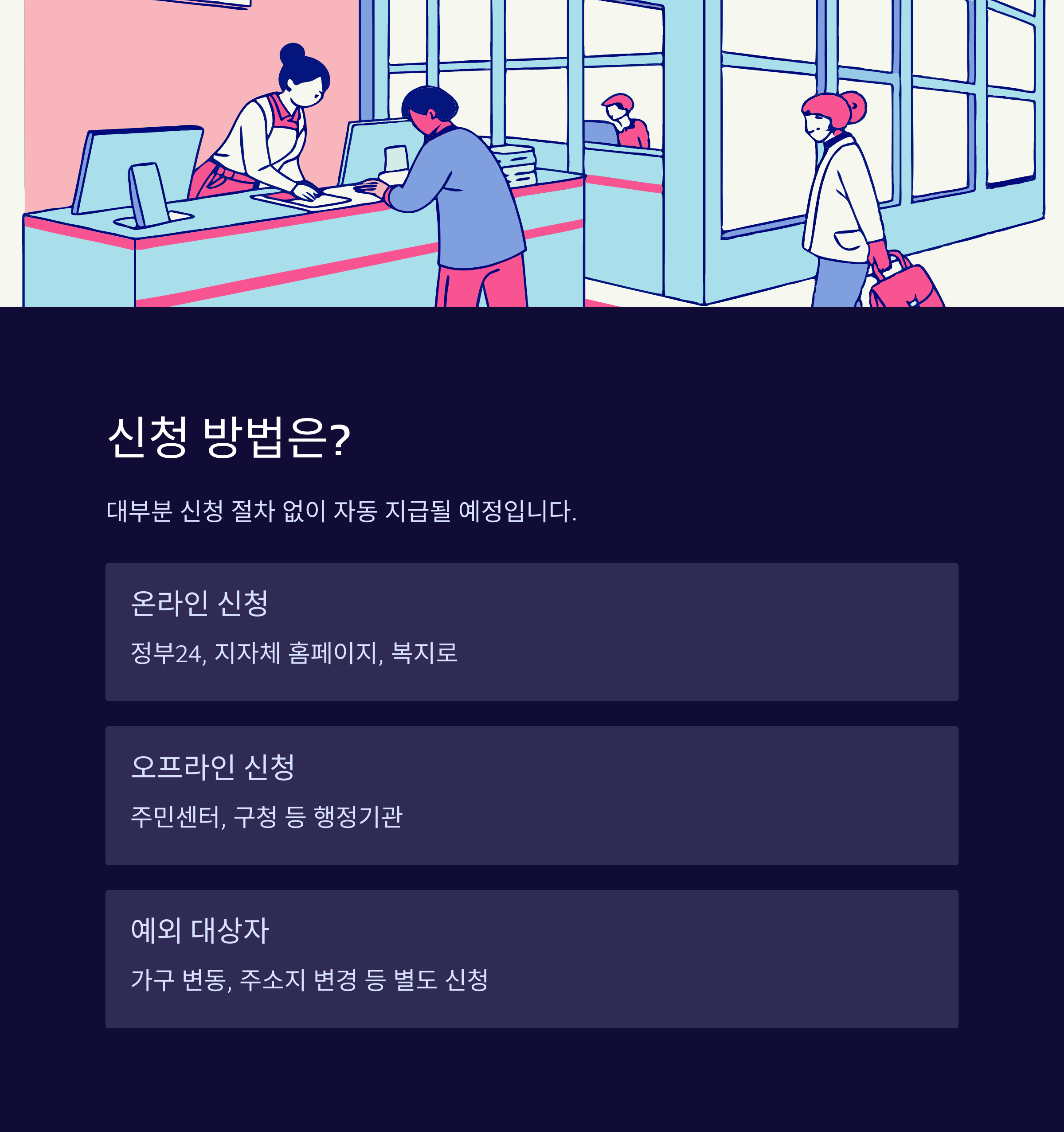 - 오프라인: 주민센터, 구청 등 행정기관 방문 신청