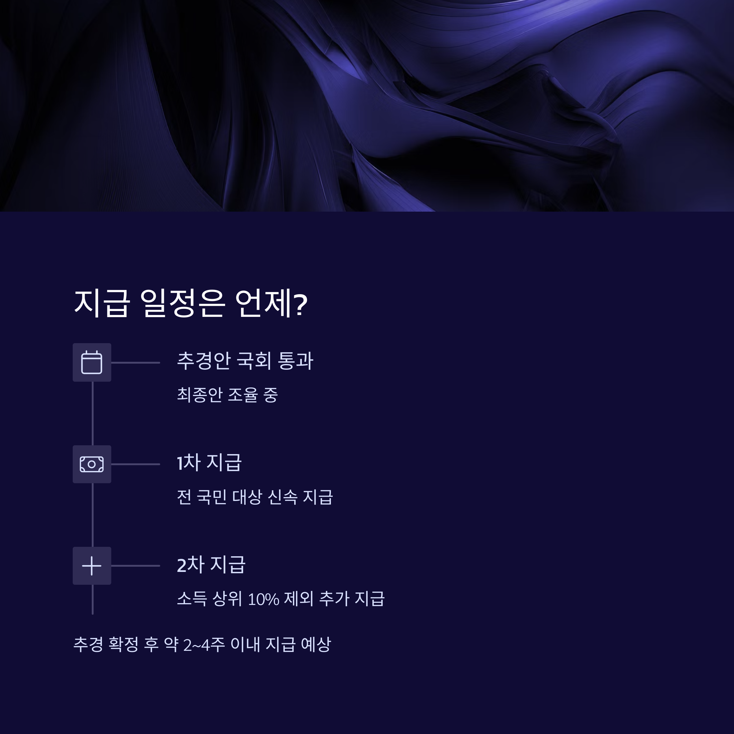 현재 정부와 국회에서 추경안을 조율 중입니다. 국회 통과 이후 빠르면 2~4주 이내 지급이 시작될 것으로 예상됩니다. 신청이 필요한 경우 별도 안내가 나올 예정입니다.