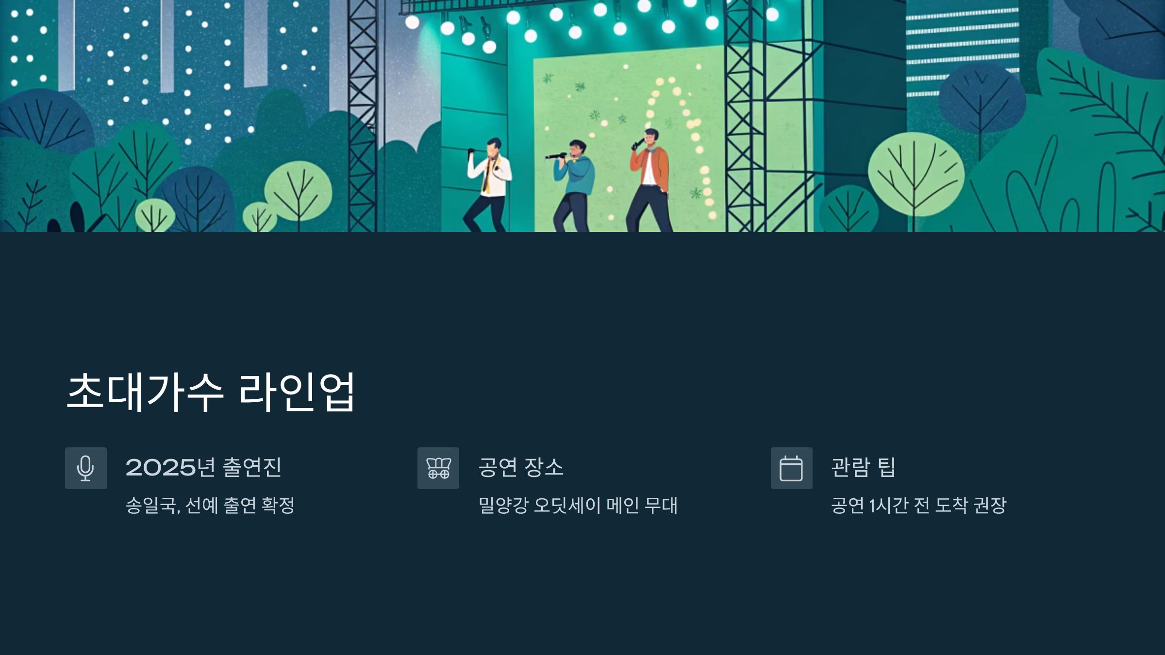 ✅ 관람 TIP: 공연 시작 최소 1시간 전에는 도착해 주차하고 자리 잡는 것이 좋아요. 늦게 가면 인기 가수 공연은 이미 만석일 수 있어요!
