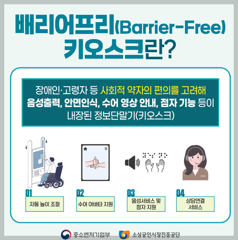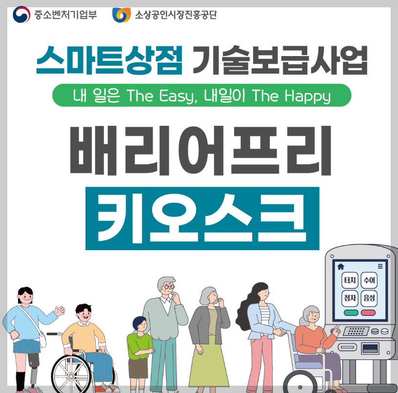 정부는 소상공인과 자영업자들을 위한 '스마트상점 지원사업'을 통해 배리어프리 키오스크 도입 비용을 부분 지원하고 있어요.