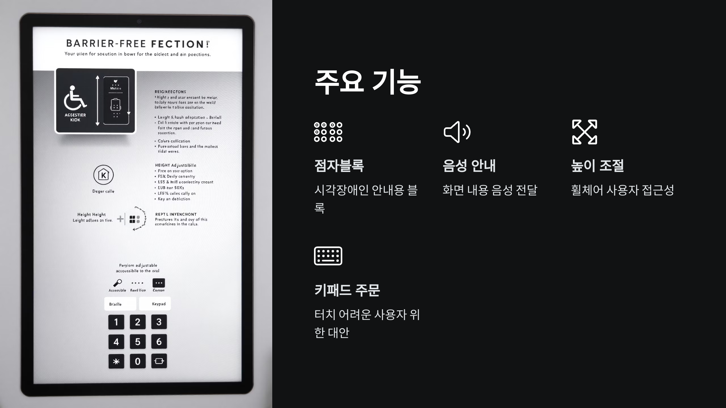 배리어프리 키오스크에는 누구나 사용할 수 있도록 설계된 접근성 기능들이 탑재되어야 합니다.