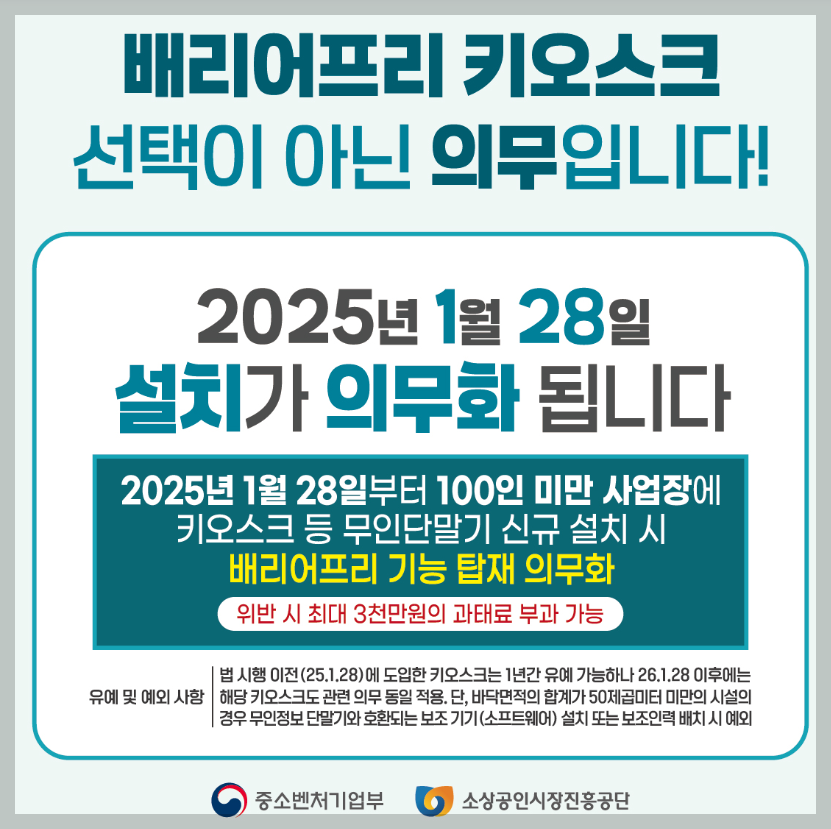 2025년 1월 28일부터, 바닥면적 50㎡ 이상 사업장에서 신규로 키오스크를 설치할 경우 반드시 배리어프리 기능이 탑재된 제품을 사용해야 합니다.