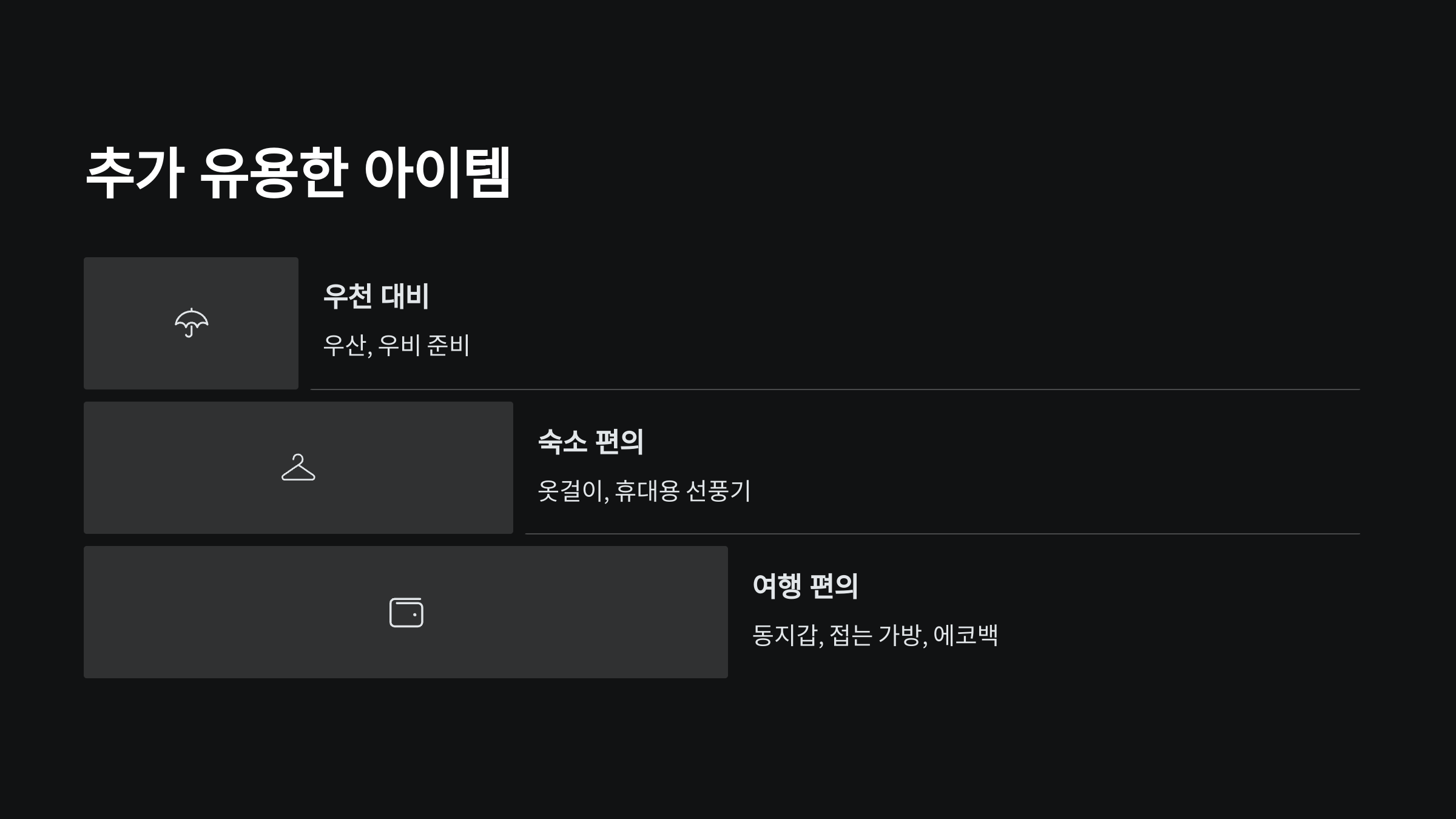 꼭 필요하지 않더라도 있으면 여행이 훨씬 쾌적해지는 준비물들이 있어요.
