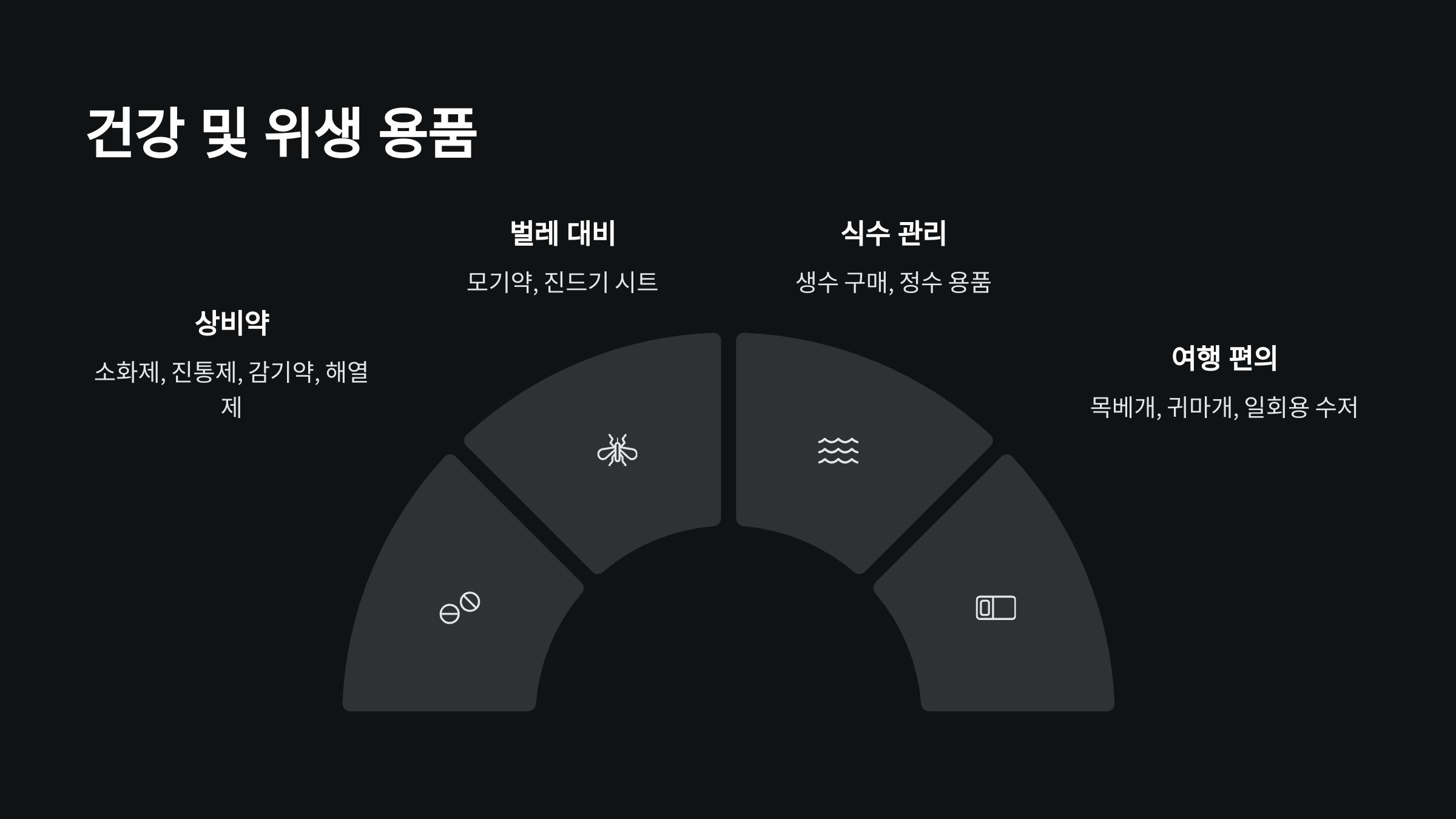 🔖 체크포인트 1: 상비약은 개인별로 자주 복용하는 약 외에도, 소화제, 진통제, 감기약, 해열제, 밴드 등을 준비하세요.