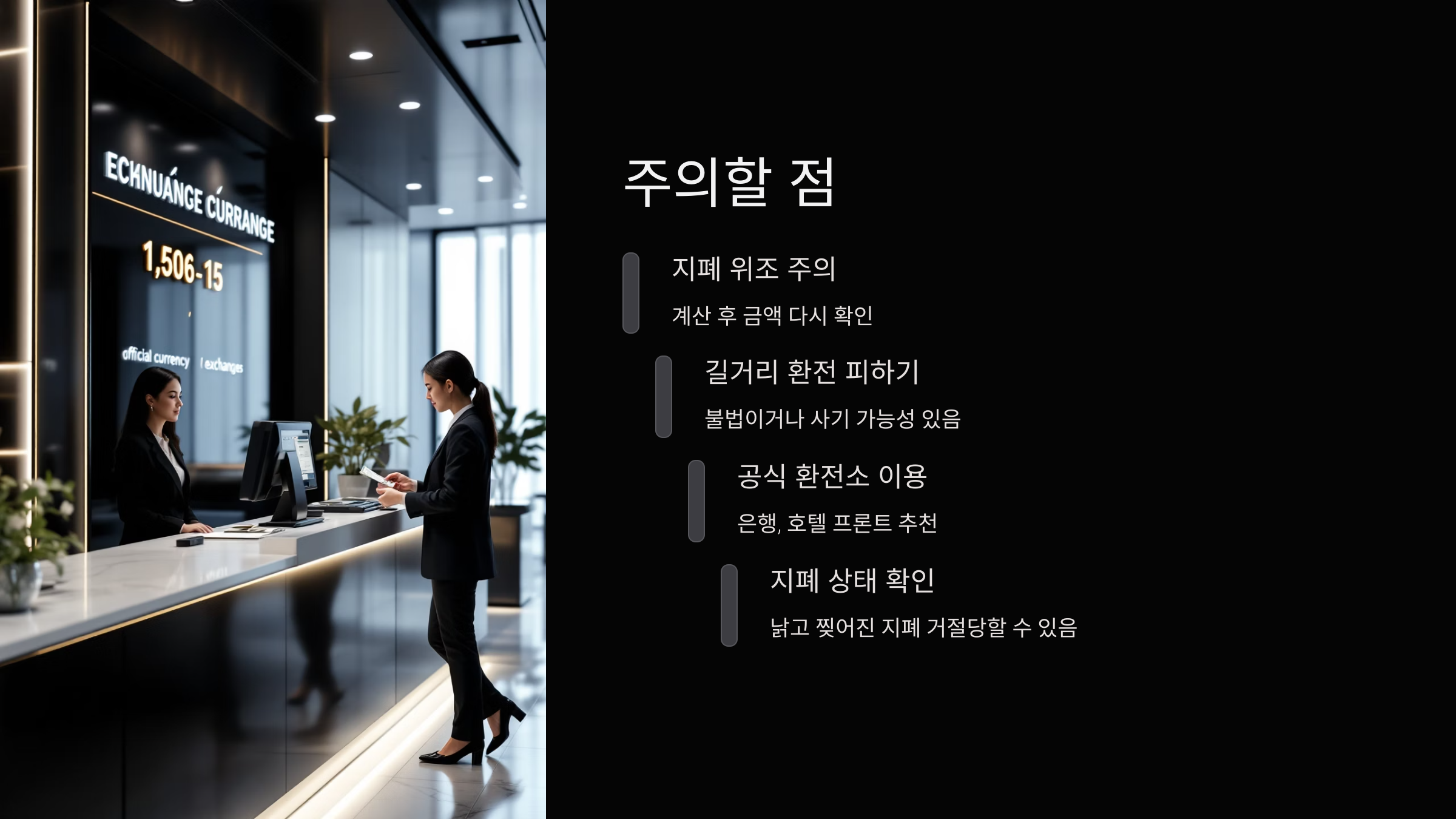 또한, 거리에서 길거리 환전을 제안하는 경우가 있는데요, 이는 불법일 수 있고 사기 가능성도 있으니 피하는 게 좋아요.