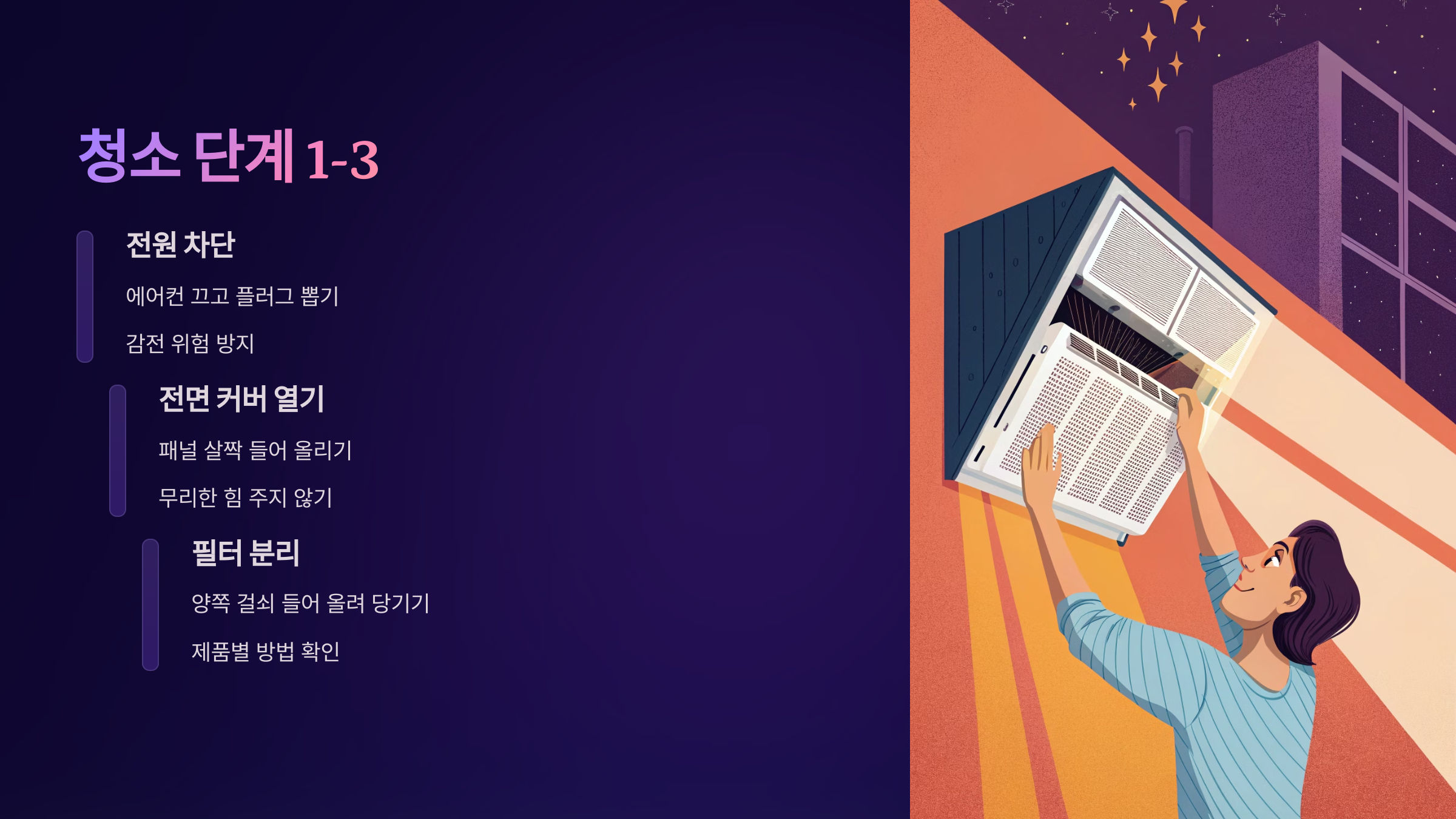정해진 방식으로 부드럽게 청소하면 오히려 수명이 늘어나고, 냉방 효율도 높아집니다.