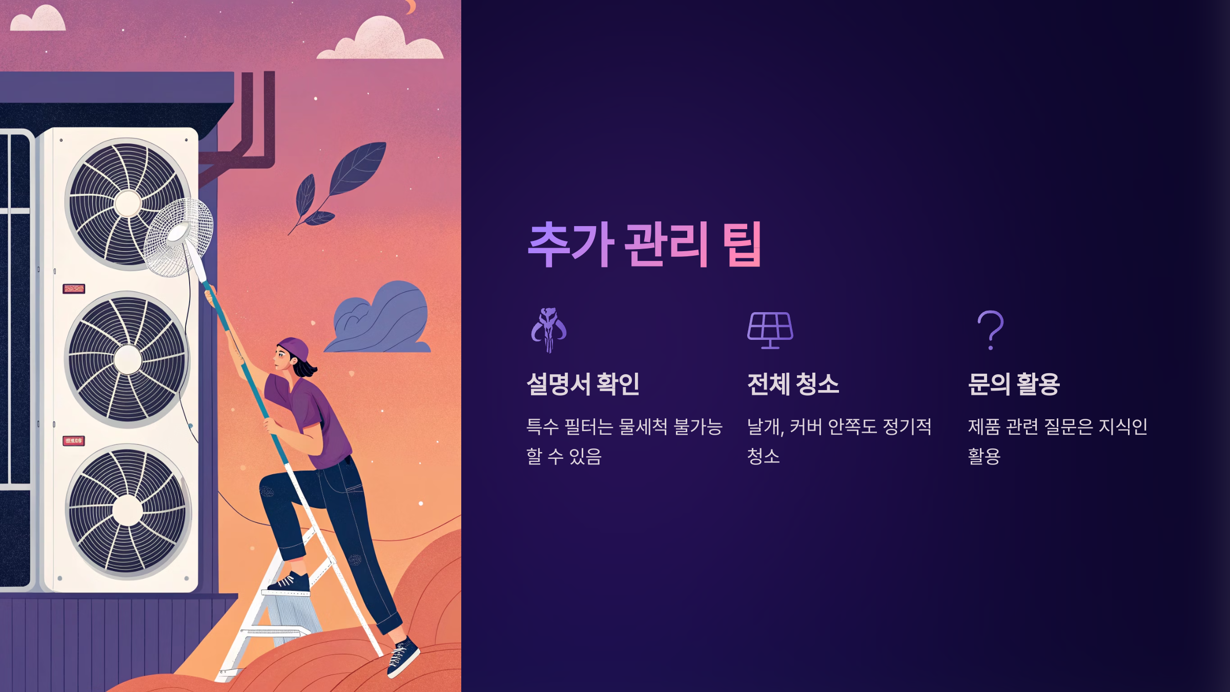 정해진 방식으로 부드럽게 청소하면 오히려 수명이 늘어나고, 냉방 효율도 높아집니다.