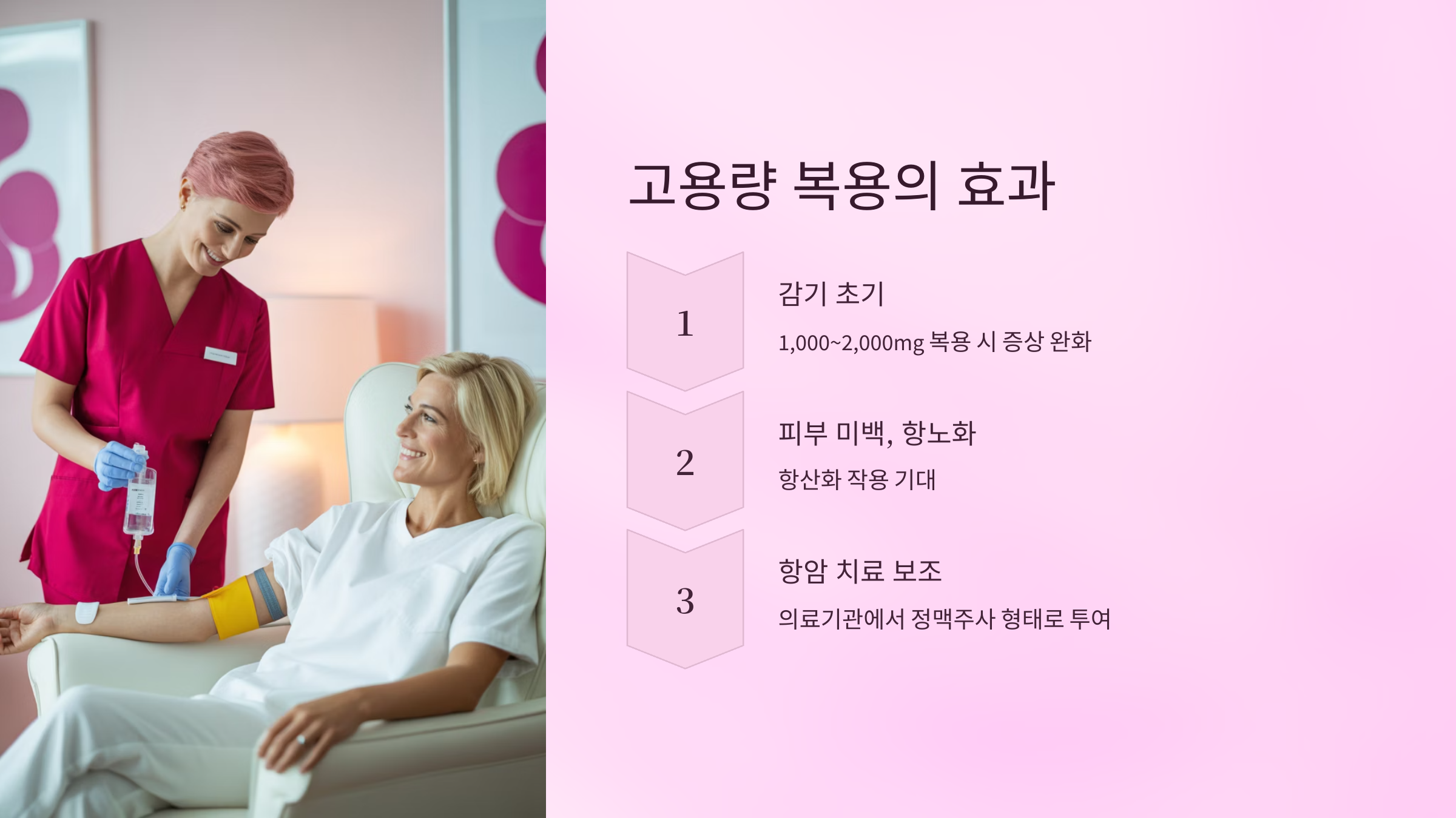 비타민 C 고용량 복용은 피로 개선, 면역력 강화, 항산화 등에서 긍정적인 영향을 줄 수 있다고 알려져 있어요.