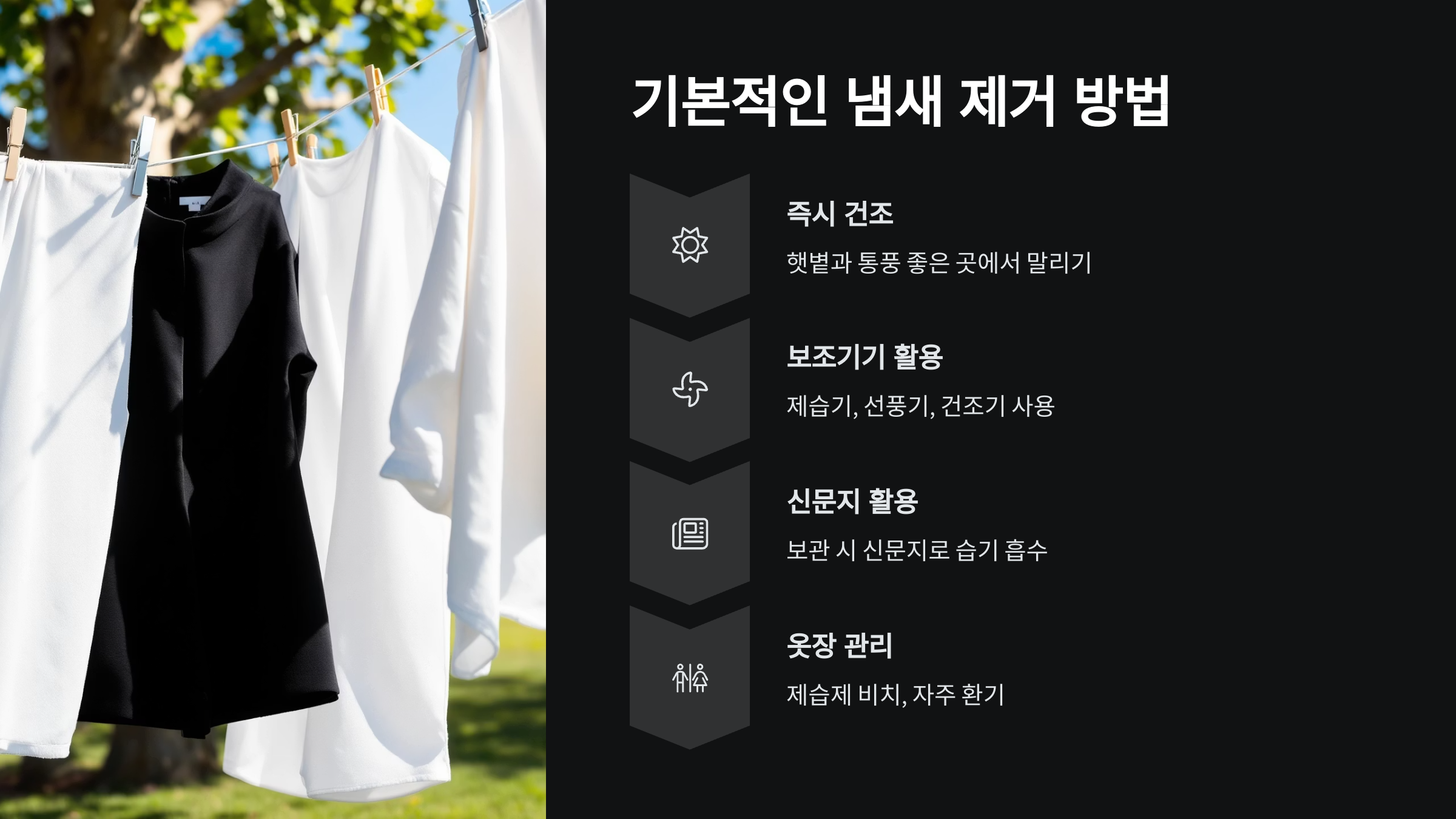 세탁과 건조를 잘 해도, 보관하는 장소인 옷장이 습하거나 환기가 안 되면 냄새는 다시 생길 수 있어요.