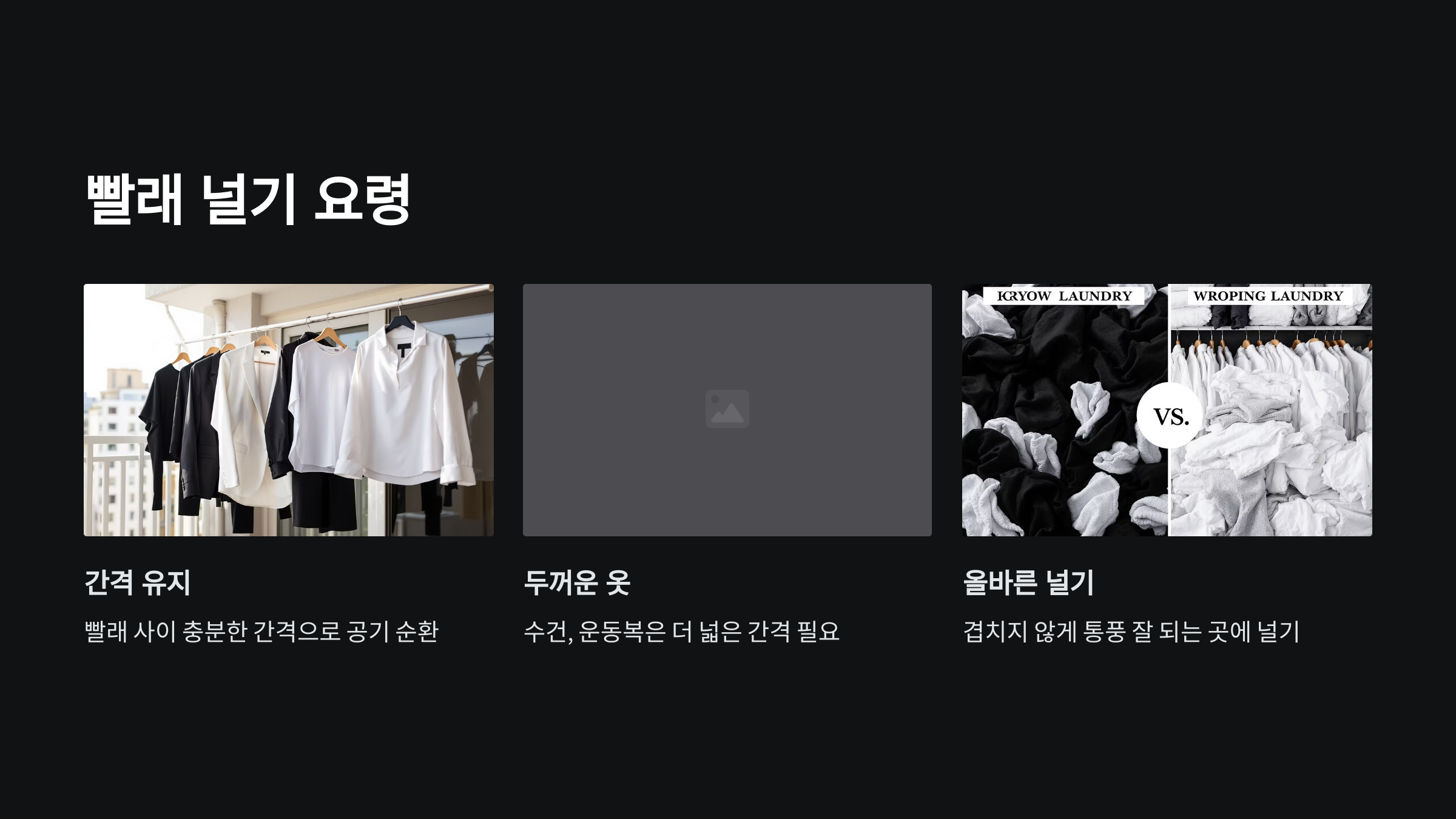| 빨래끼리 겹쳐져 있음 | 간격을 넓게 두고 널기 |