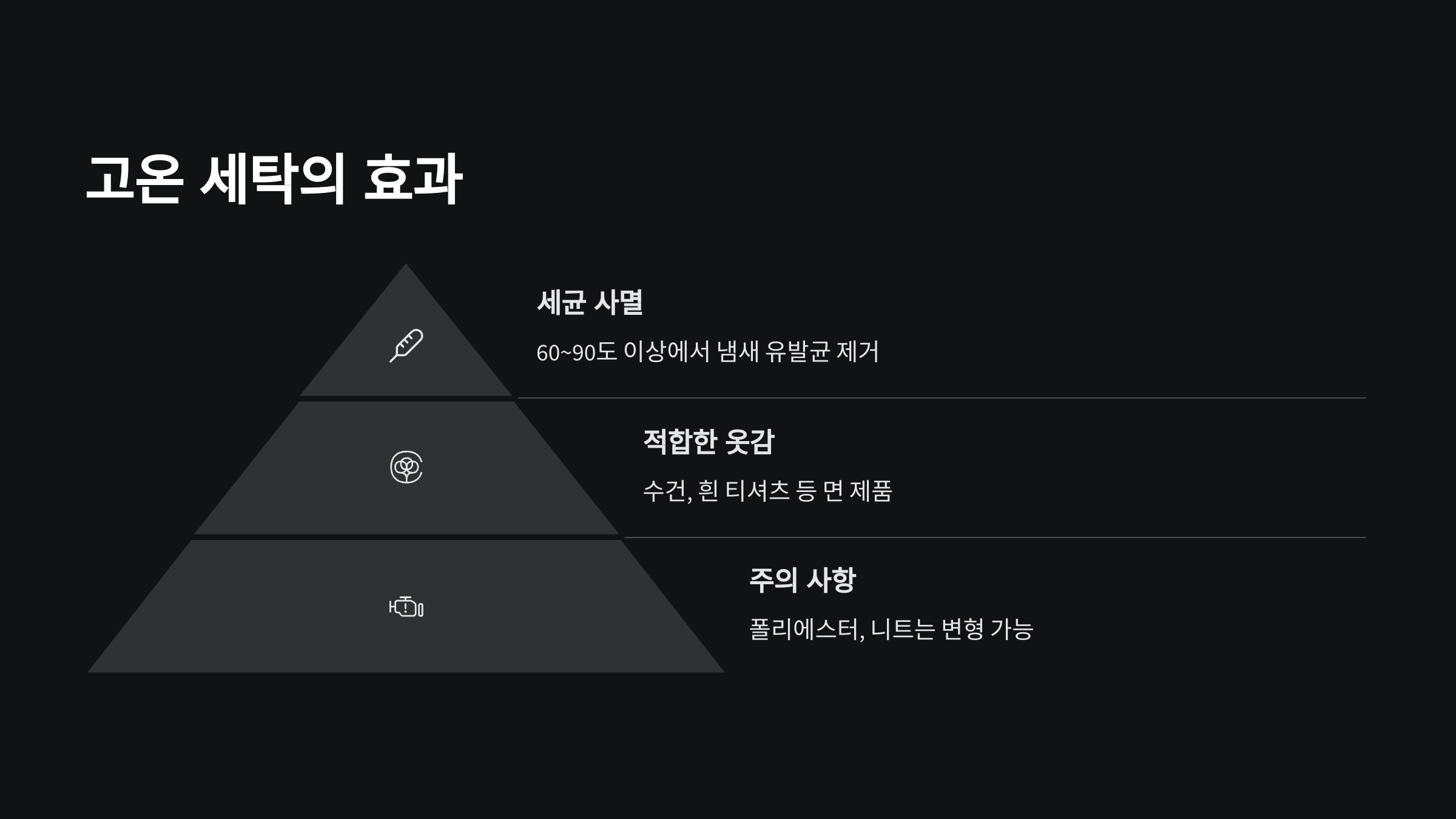 고온 세탁이 모든 옷에 다 좋은 건 아니에요. 폴리에스터, 니트 등 열에 약한 소재는 변형될 수 있어요.