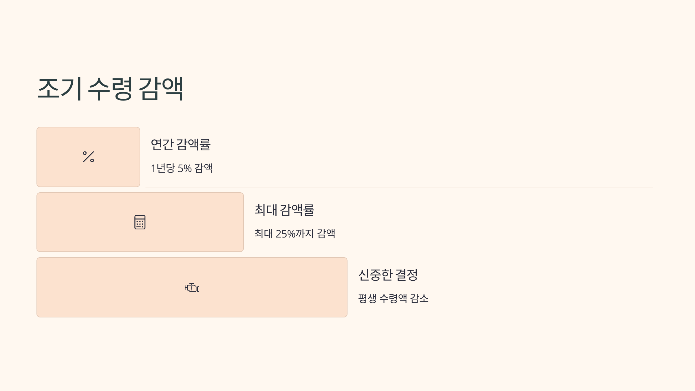조기 수령은 만 60세부터 가능하지만, 연도마다 5%씩 최대 25%까지 감액되기 때문에 신중한 결정이 필요해요.