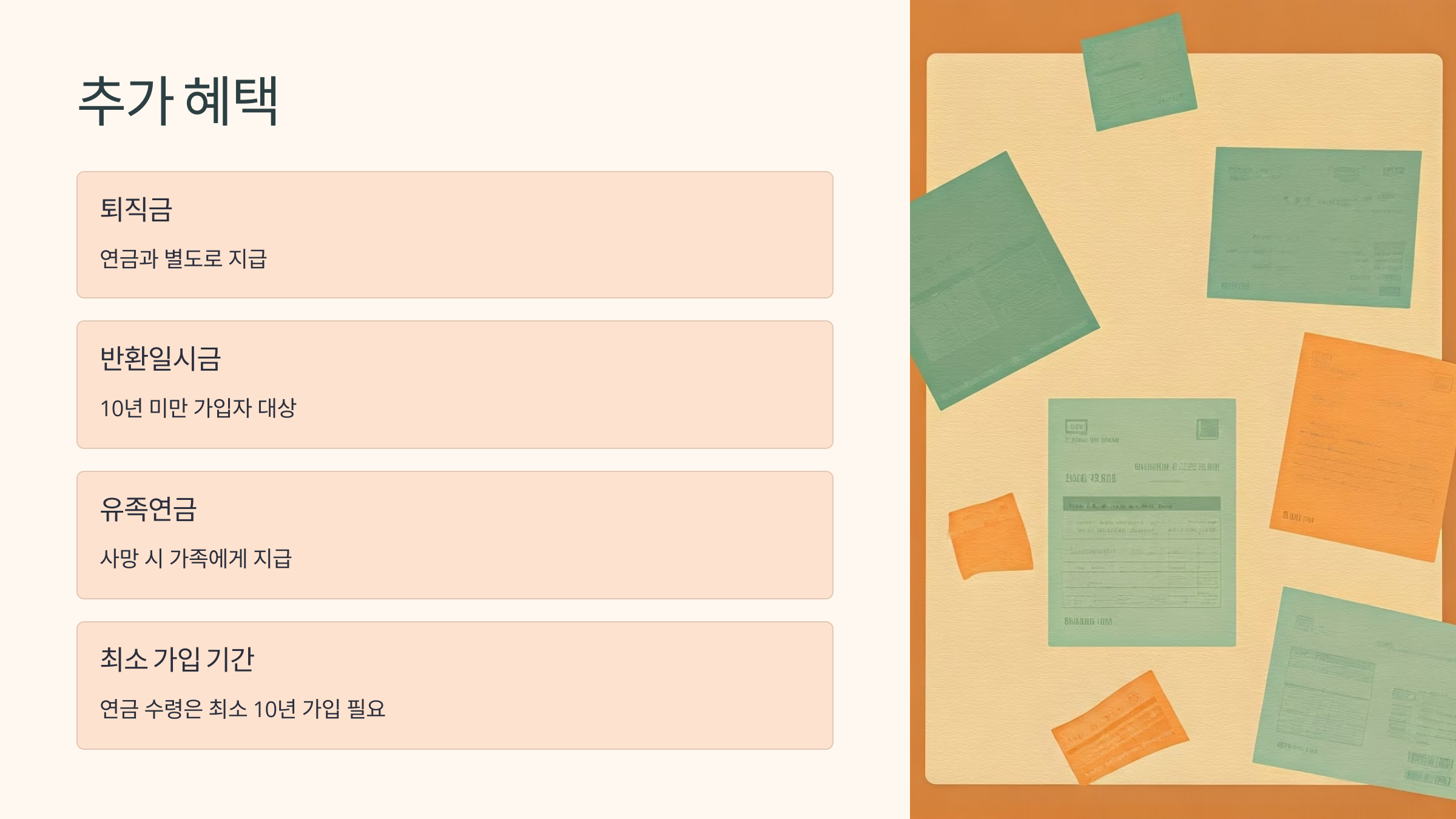 퇴직금, 반환일시금, 유족연금 등 다양한 혜택이 포함되어 있답니다.