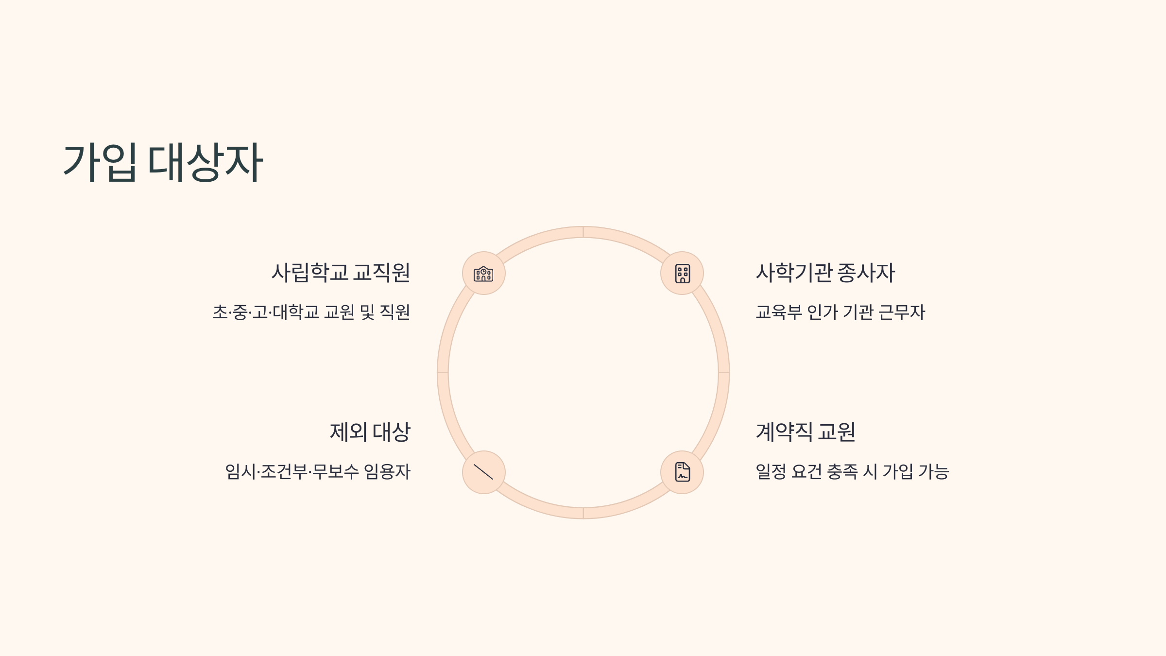 사립 초·중·고·대학교 교직원과 교육부 인가 사학기관 종사자가 기본 가입 대상이에요.