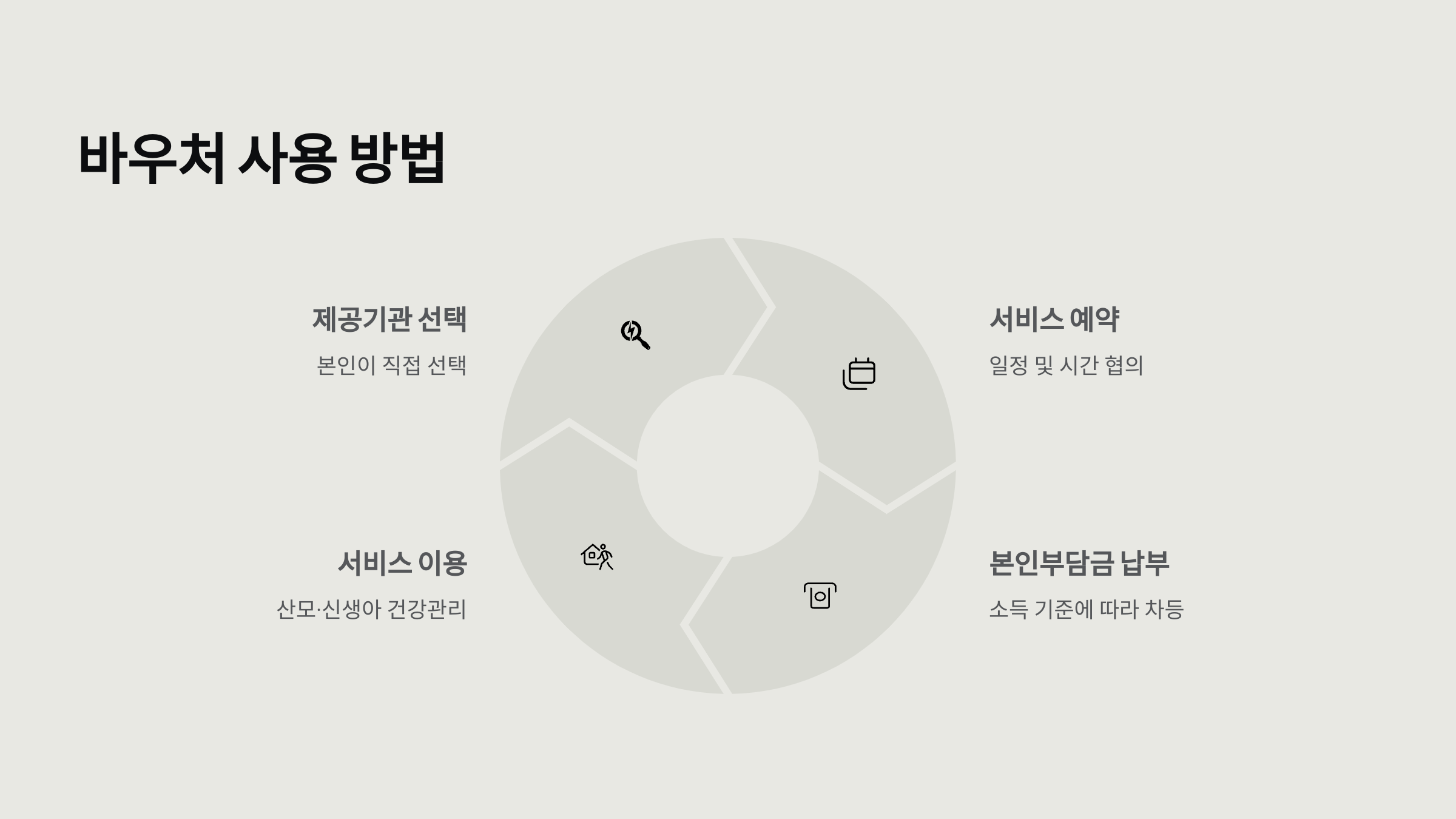 바우처는 정부가 산후관리 서비스 이용 비용을 대신 지불해주는 쿠폰 형태로, 이용자는 본인부담금만 납부하면 돼요.