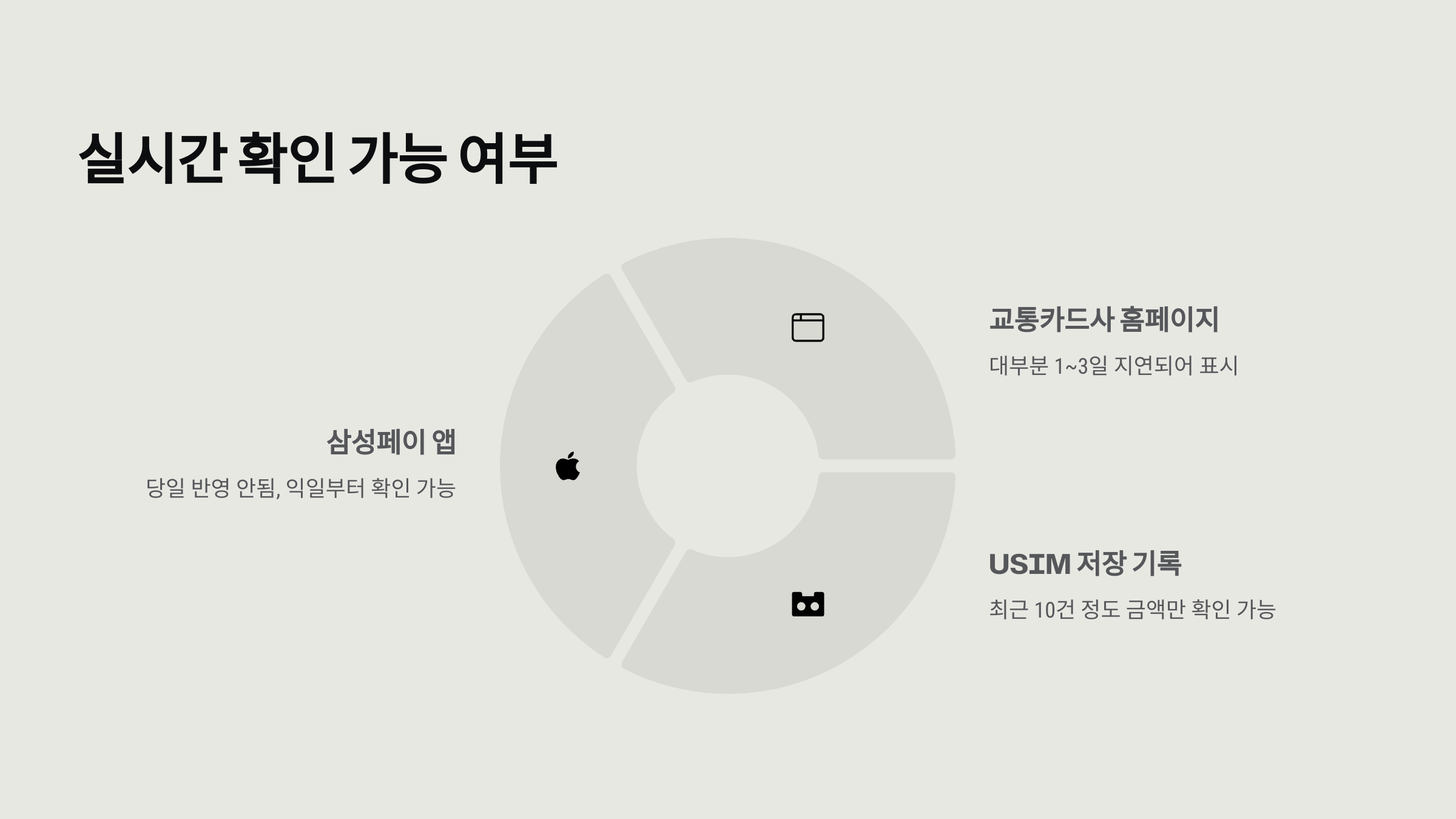 - USIM 저장 기록: 가장 최근 10건 정도는 금액 기준으로 앱에서 볼 수 있어요 (날짜 없음).