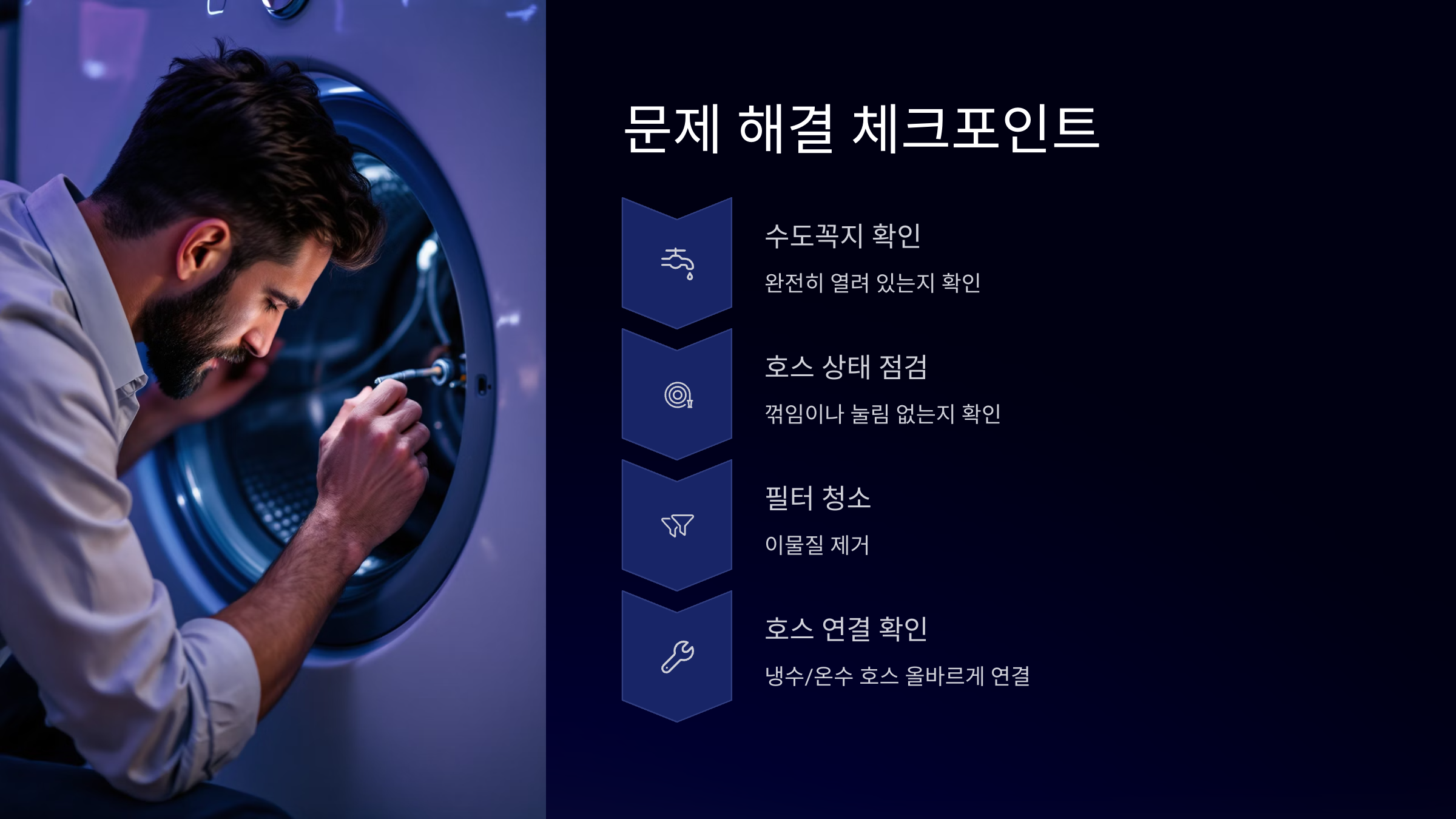 수도, 호스, 필터 점검만으로도 쉽게 해결 가능하니 너무 걱정하지 마세요.