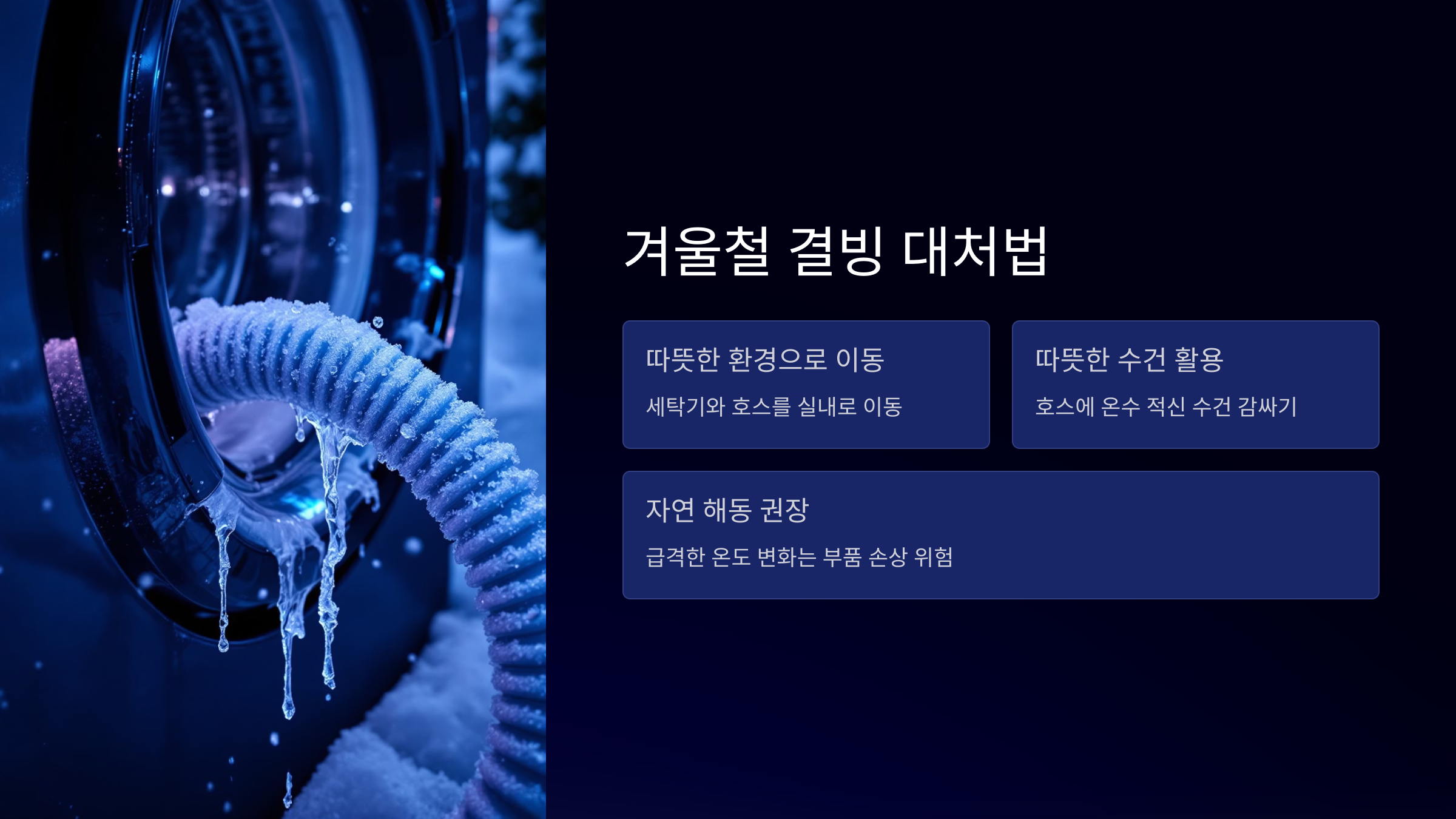 호스나 세탁기 주변을 보온재로 감싸두거나 실내에 두는 것이 좋아요. 사용하지 않을 땐 물을 빼두는 것도 방법입니다.