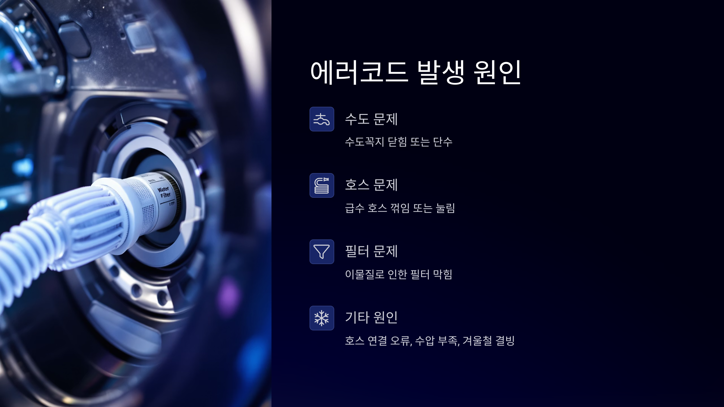 대부분 외부 요인으로 발생하는 에러입니다. 급수 상태, 호스, 필터 등을 점검하면 쉽게 해결할 수 있어요.