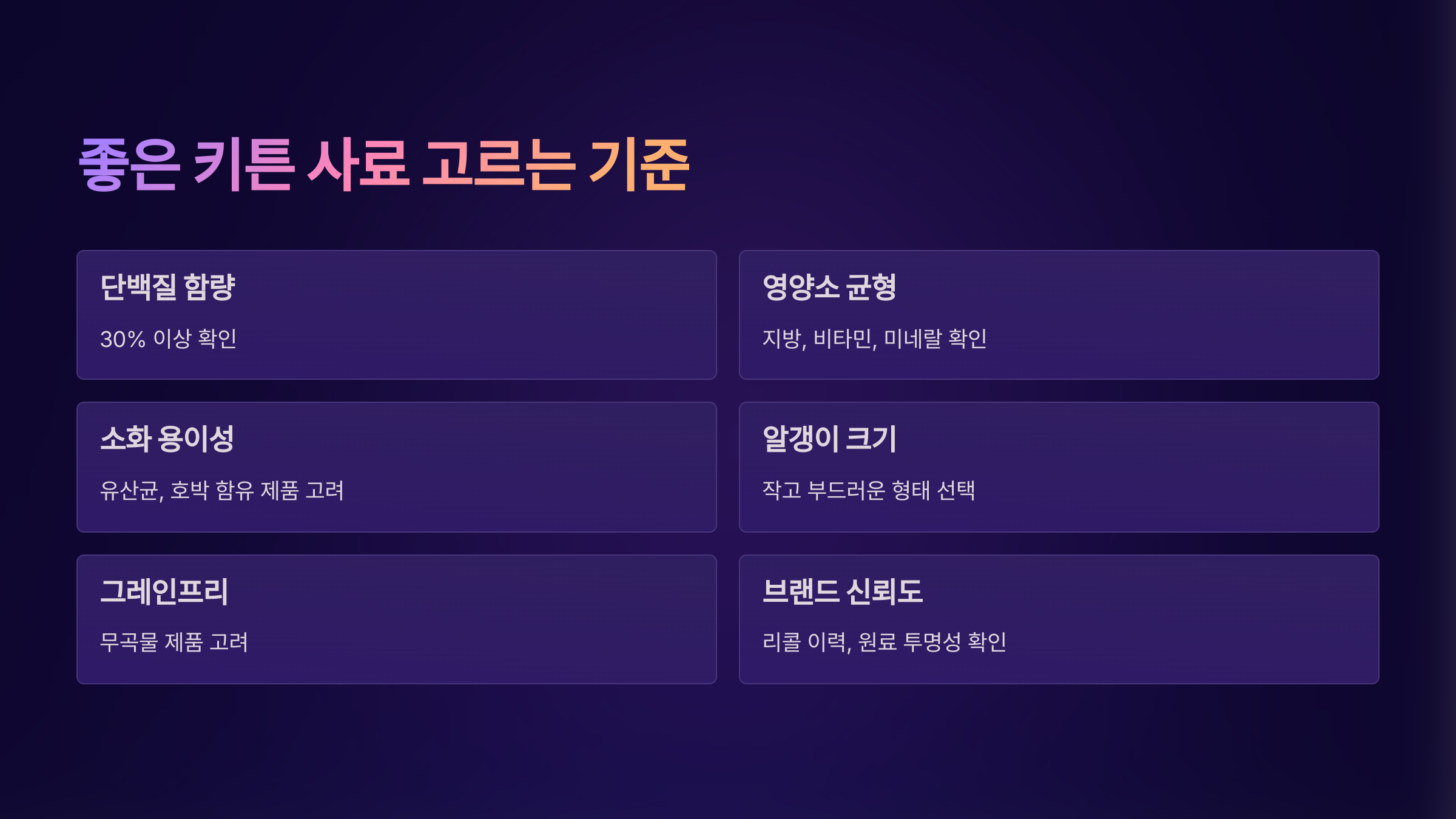 좋은 키튼 사료를 고르기 위해서는 다음 요소들을 꼭 확인해 주세요.