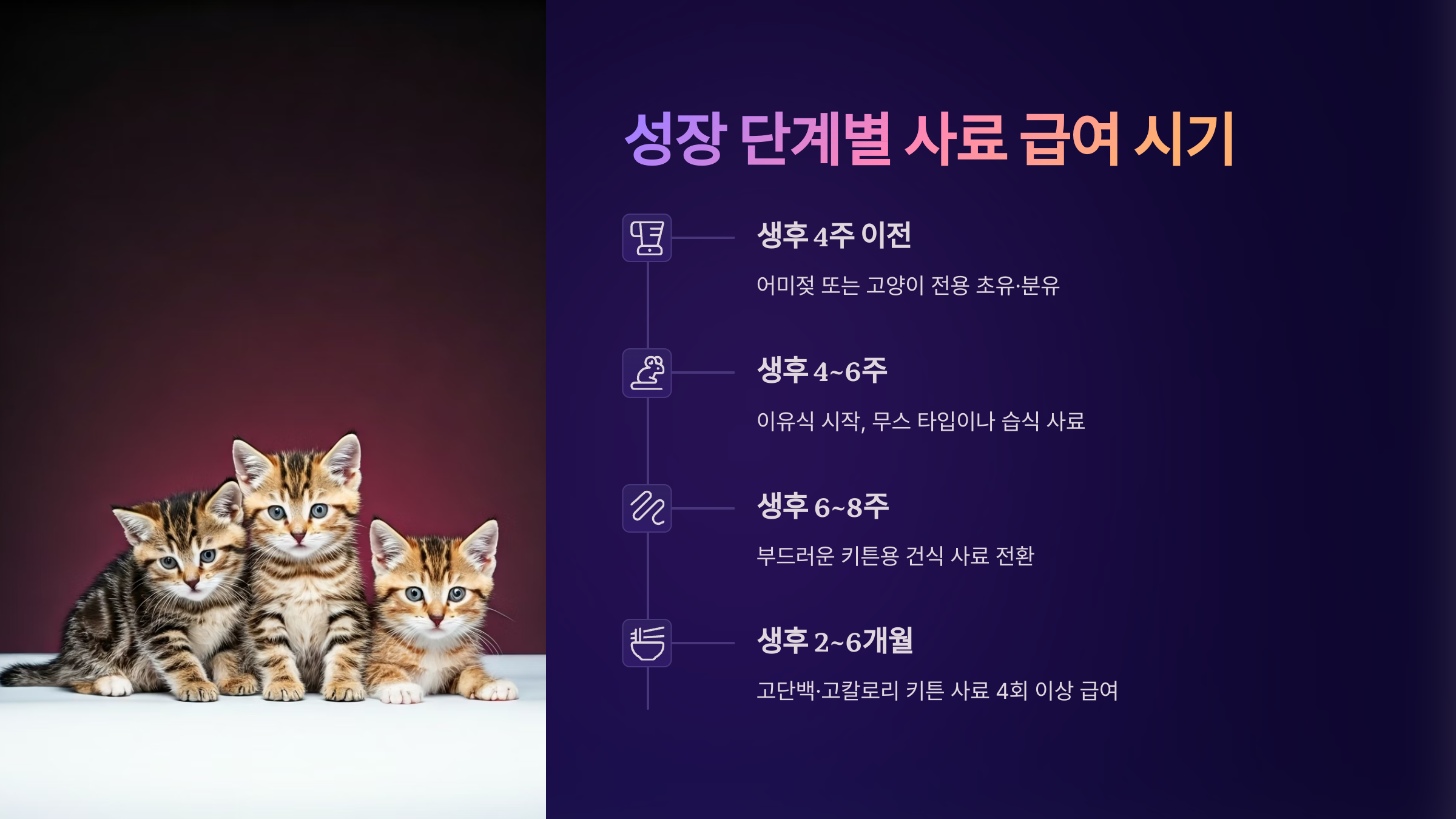 아깽이의 성장 단계별로 사료 급여 시기와 종류가 달라져요.